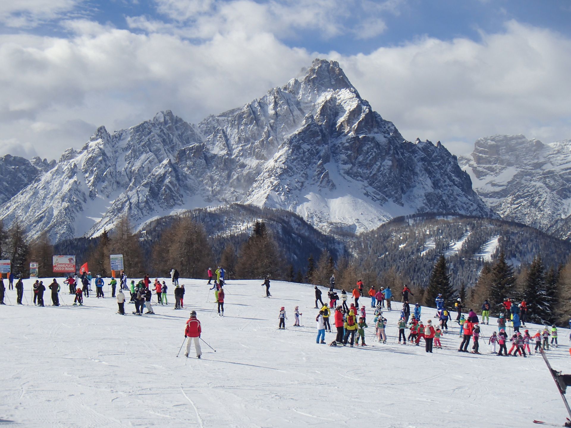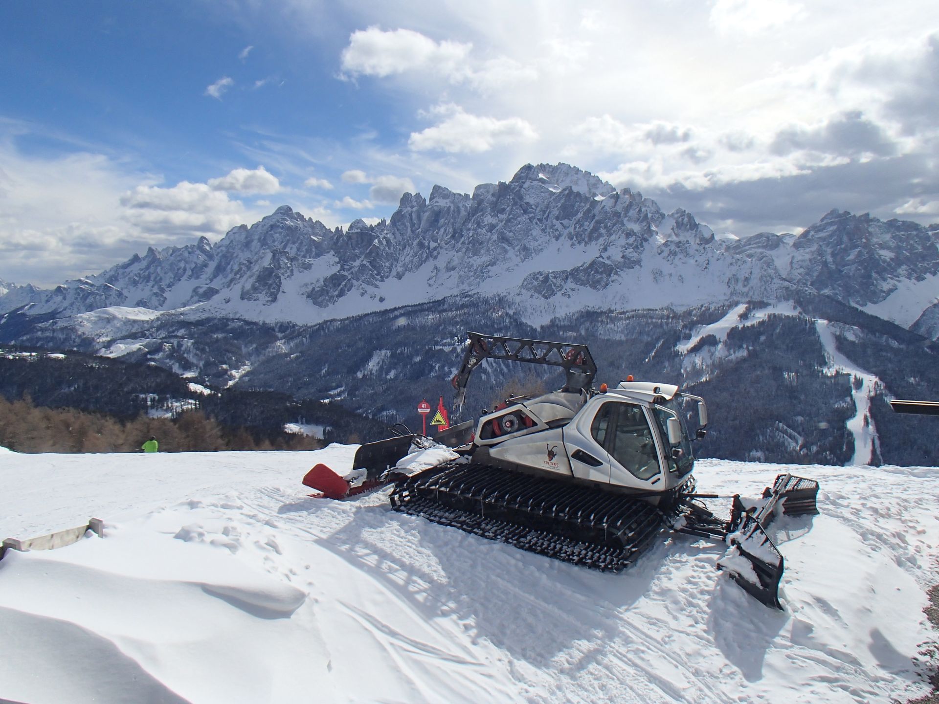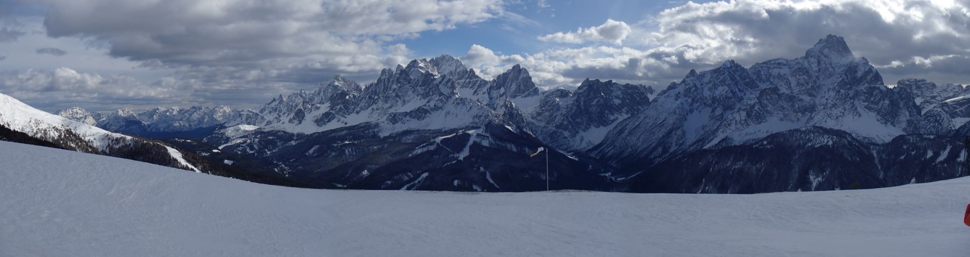 Wieder dauerte die Anfahrt bei schönem Sonnenschein eine Stunde. Im Gebiet Helm testeten wir zuerst mal kurz die Schneeverhältnisse und schaukelten dann zur Rotwand hinüber. Angeblich findet man hier mit 71% Gefälle die steilsten schwarzen Abfahrten Südtirols in Form der Holzriese Pisten. Da wir hier alles schön griffig und leer vorfanden stellte sich der Eindruck ein, dass wir in Südtirol schon spektakulärere Pisten gefahren waren. Das Fahrvergnügen war hierdurch allerdings überhaupt nicht getrübt. Wir hatten sehr viel Spaß an diesem Tag, genossen die phantastischen Aussichten in diesem Skigebiet, welches sich auch Drei Zinnen Dolomiten nennt.