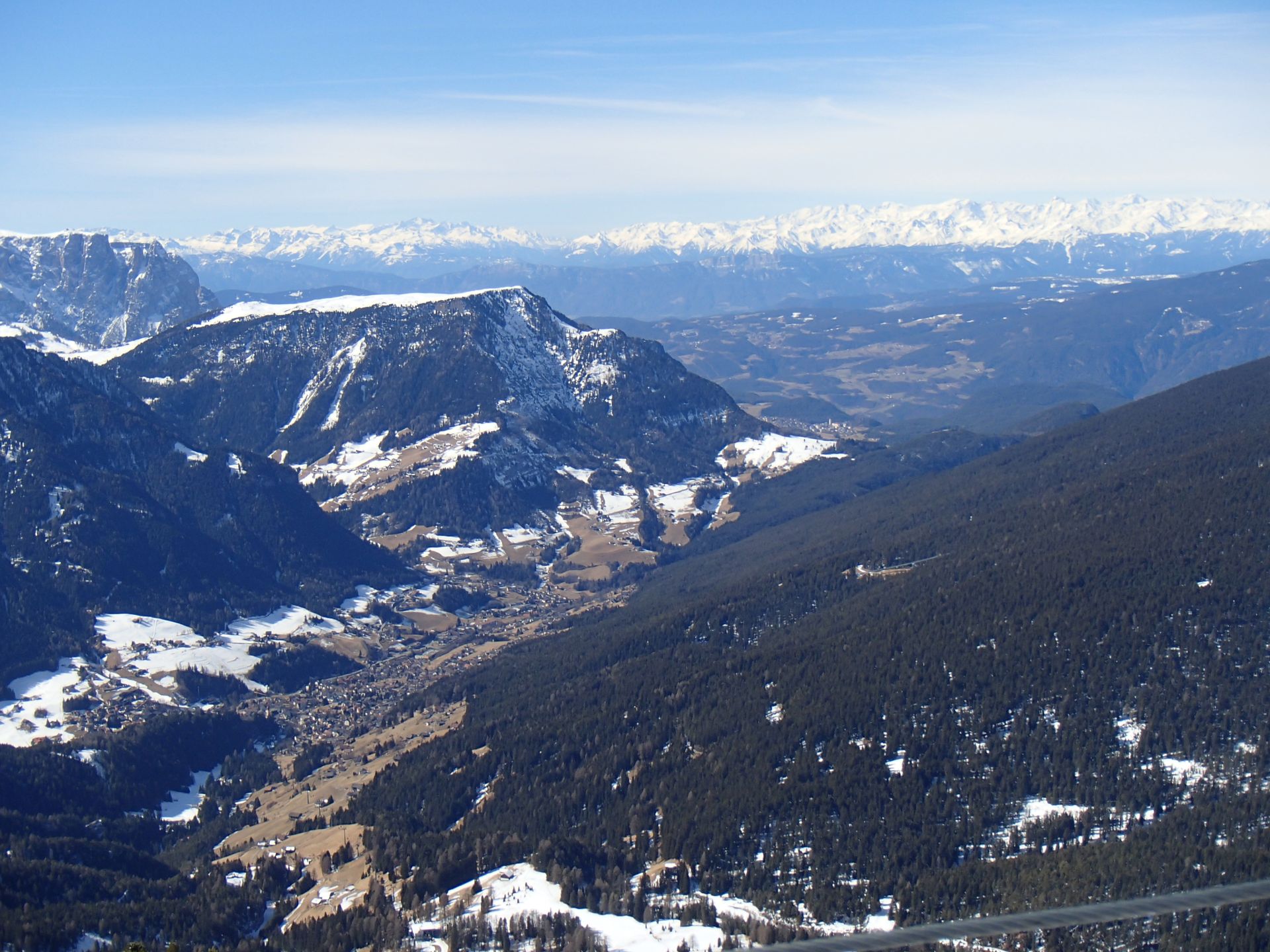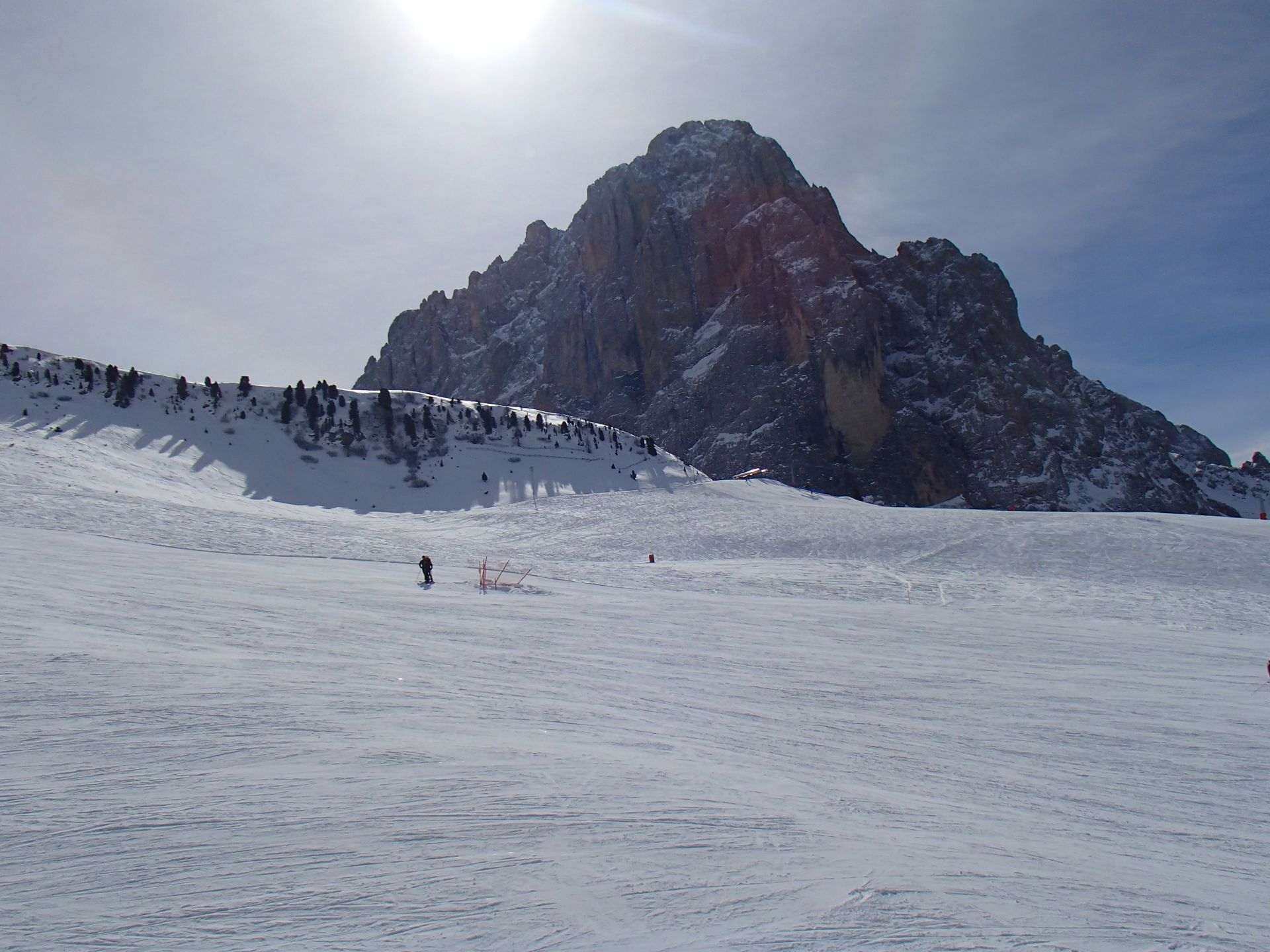Mit Hilfe eines Förderbandes auf dem Parkplatz konnte man sich zur Talstation der unterirdischen Standseilbahn transportieren lassen. Mit einer Gondel schwebten wir dann über grüne Wiesen ins Skigebiet. Auf 2500 Meter Höhe fanden wir sehr gute Schneeverhältnisse vor. Die lange, leicht zu fahrende, aber landschaftlich sehr schöne Abfahrt nach St. Ulrich gönnten wir uns gleich zwei Mal. Bei der Einkehr auf einer schönen Hütte mitten im Skigebiet durften wir dann feststellen, das Preise und die Größe von Portionen in einem umgekehrt proportionalen Verhältnis stehen können.