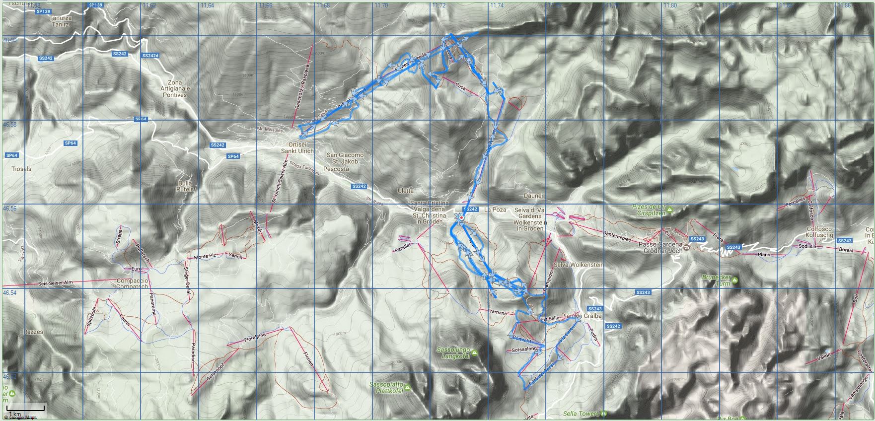 Auch am Mittwoch stand uns ein Tag mit bestem Wetter bevor. Die Anfahrt zum Skigebiet um St. Christina im Grödnertal führte uns wieder über die Brennerautobahn und dann das Grödnertal fast ganz hinauf. Der Wanderführer erzählte spannende Geschichten, so das die Anfahrt kurzweilig verlief. Der Bus parkte fast direkt am Zieleinlauf der Weltcupstrecke. Dieser Ort an der Sellronda zeigte sich natürlich wesentlich belebter und touristischer, als die etwas abgelegenen Skigebiete der Vortage.