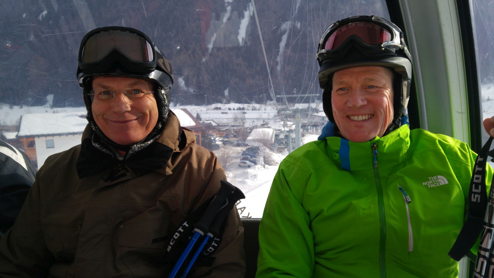 Am nächsten Morgen fanden sich dann alle wieder frisch zum guten und umfangreichen Frühstücksbuffet ein. Mit dem örtlichen Skibus kurvten wir von Mühlbach nach Vals, um direkt den ersten Kontakt mit dem Schnee im Skigebiet "GITSCHBERG-JOCHTAL"zu suchen. Das Wetter und die Pisten waren optimal und es sollte ein Super-Skitag werden. Auf dem Foto links oben sieht man die Vorfreude bei der ersten Liftfahrt in den Augen von Pete und Harald. Es war recht kalt, so bis -18°C, aber den ganzen Tag blieb es sonnig.