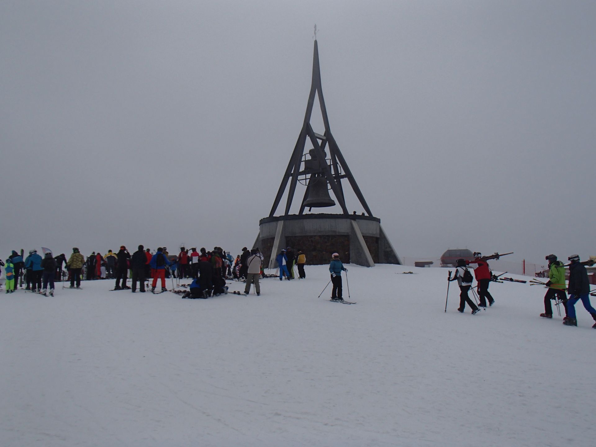 Erstaunt stellten wir am Morgen vor dem Bus fest, dass die Woche wie im Fluge vergangen war. Erfreulicherweise stand ein Besuch im "SKIGEBIET KRONPLATZ" auf dem Plan, eines der modernsten Skigebiete in Südtirol, welches wir im Vorjahr nicht aufsuchen konnten. Schon nach knapp über einer halben Stunde standen wir bei Reischach auf dem Parkplatz. Im Januar und Februar hatten an jedem Tag mehr als 22.000 Skifahrer dieses Gebiet besucht. Wenn man nach der ersten Gondelfahrt oben auf der Kuppe dieses imposanten Bergs ankommt, dann sieht man die größte Ansammlung von modernen Aufstiegsanlagen auf kleinstem Raum in Südtirol, sowie die Friedensglocke (s. links), die vom Dalai Lama eingeweiht wurde.