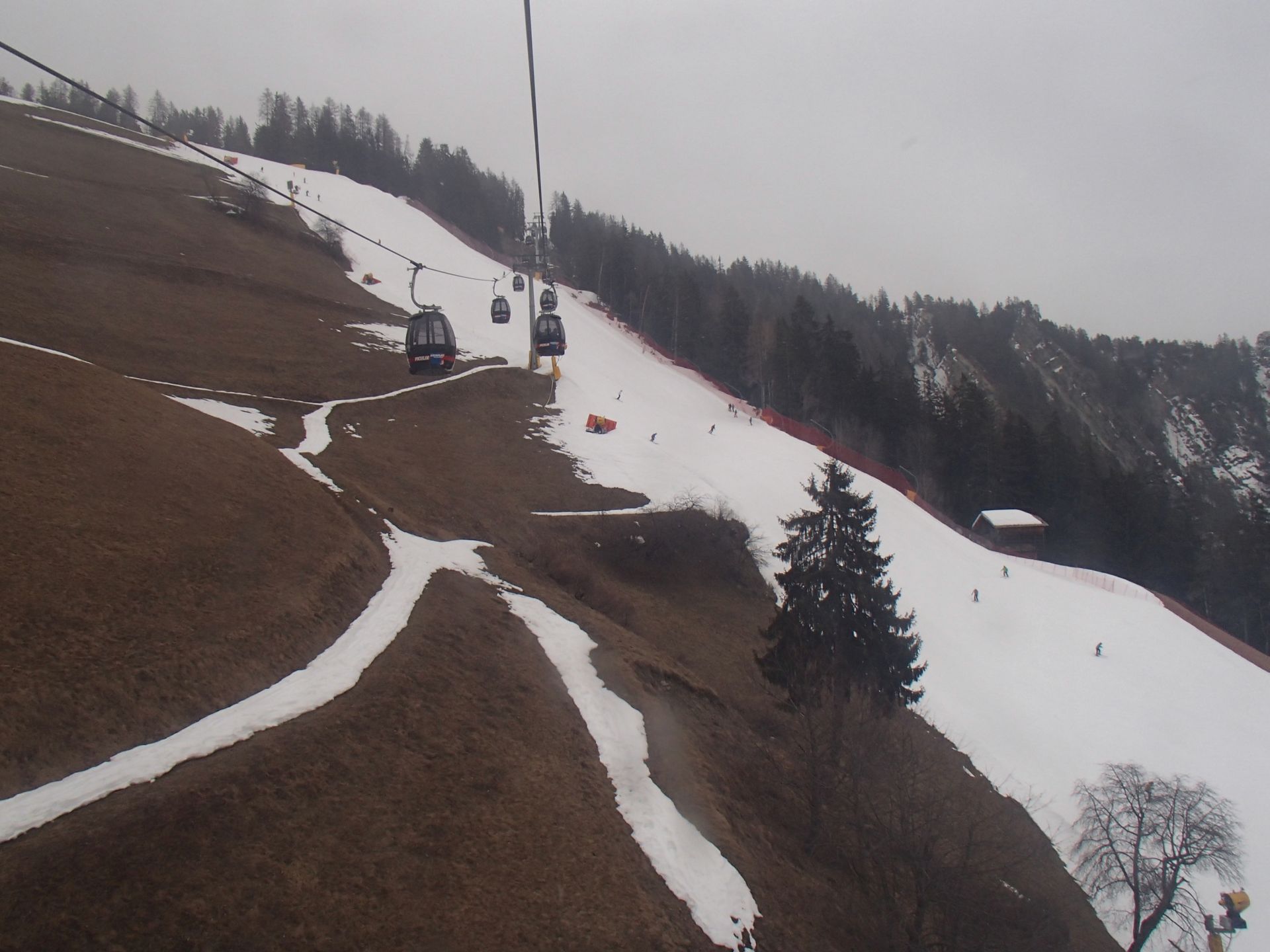 Fairerweise muss man sagen, dass diese Konzentration von Aufstiegsanlagen zu einer Art Ameisenhaufen im oberen Bereich führt. Man ist gut beraten hier oben sehr vorsichtig und umsichtig zu fahren, da hier zwar langsam, aber wild durcheinander gefahren wird. Zu allen Seiten des Bergs hin gibt es interessante Abfahrten, die wir an diesem Tag nicht annähernd komplett fahren konnten. Der Himmel war bedeckt, aber die Sicht war ganz gut. Unser erstes Zwischenziel war die weit entfernte Piculin Abfahrt. Dazu mussten wir uns erst mal mit Hilfe von 4 Abfahrten vom Norden bis in den Süden arbeiten. Bei St. Vigil in Enneberg überquerten wir die Straße und legten, auch wegen des einsetzten leichten Schneefalls, eine Pause in der Ütia Ala Cir Hütte ein. Man ist hier nicht besonders hoch, aber in Richtungen bergab wird es richtig steil mit über 55%. Da sich die Piculin zudem noch verreist und als schräger Hang präsentierte, konnte man hier einige Stürze beobachten. Das Foto links zeigt den schwierigsten Bereich vom Lift aus gesehen.