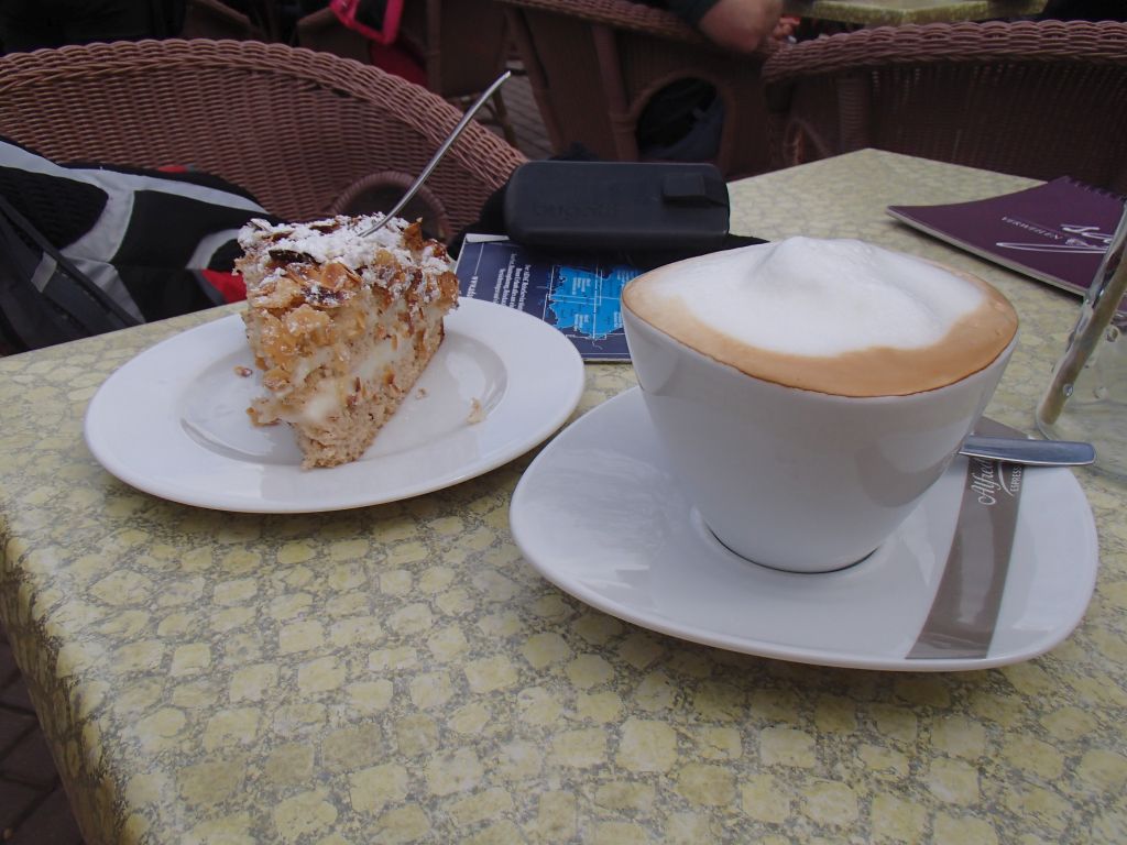 Auf dem Marktplatz von Holzminden erwarteten uns schon sehr viele Radfahrer, die auf dem beliebten Weserradweg, quer zu unserer Richtung unterwegs waren. Aber hier war Platz genug für alle und gutes Wetter, so dass wir draußen unsere erste Pause hatten. Wir genehmigten uns ein sehr gutes Stück Torte (s. links), das uns noch über einige Anstieg helfen sollte. Hinter Holzminden ging es auf Nebenstrecken über Allerheim, Bevern, Lobach, Negenborn bis Escherhausen, wo es die "Müsliriegelpause" (s. links unten) gab. Danach ging es weiter auf und ab bis Ahlfeld an der Leine, ein Industrieort mit schlechter Luft, der nicht zum Verweilen einlud.
