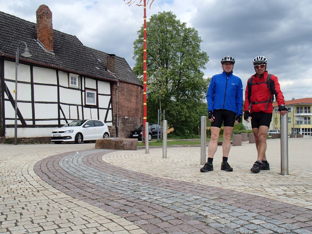 Diesmal dauerte das Frühstück länger als üblich. Am Nebentisch kamen wir mit einem Radfahrer ins Gespräch, der in Köln Pesch ein paar Häuser vom Volker entfernt groß geworden ist. Auch er war wie wir zufällig in Bad Driburg gelandet. Wie schon am Vortag mussten wir dann erst mal wieder auf die geplante Strecke zurückkommen. Auf sehr kleinen verkehrsarmen Straßen ging es über Bad Herrmansborn und Pömbsen bei Nieheim auf die Route zurück.