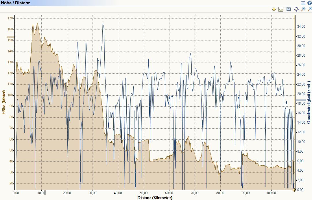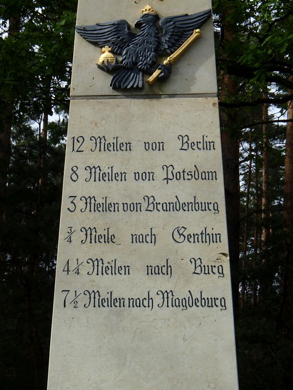 Erfreulicherweise hörte der Regen nach der Mittagspause bald auf. Nachdem wir auf der Kanalbrücke des Mittellandkanals die Elbe überquert hatten, ging es in zügiger Fahrt am Elbe-Havelkanal entlang bis Burg. Hier trafen wir wieder auf die B1 und das Jerichower Land, was sich als fast menschenleer erwies. Radfahrmäßig gab es nun leider keine Alternativen mehr zur B1. Dieser folgten wir kilometerlang in strammer Fahrt schnurgeradeaus zwischen den wenigen Orten. Irgendwo mitten in einem der riesigen Wälder stießen wir auf diesen sehr gut erhaltenen preußischen Meilenstein (s. links). In Genthin legten wir noch eine verspätete Kaffeepause ein. Nachdem wir aus Sachsen-Anhalt nach Brandenburg kamen, erschienen auch wieder Radwege an der B1. In Plaue am See fanden wir dann Unterkunft in einem schönen Hotel. Nach dem Essen haben wir uns noch lange mit einem sportlichen Ehepaar über Kadersport und Jugendförderung unterhalten, das den dortigen Schwimmverein betreibt.