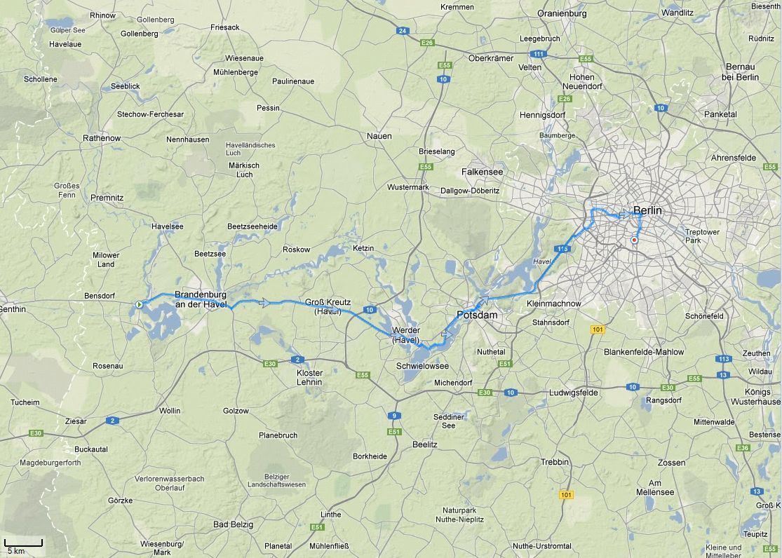 Wieder waren wir auf der B1 unterwegs, allerdings nun durchgehend auf guten Radwegen. Nachdem wir Groß Kreutz passiert hatten erreichten wir bald Werder an der Havel. Dies ist ein bekannter regionaler Obst Ort mit vielen Seen im Umfeld. Generell ist die Gegend von vielen Kanälen durchflossen, von denen wir einige überquerten. Hinter Werder fuhren wir dann auf kleinen Straßen und Wegen direkt am Schwielowsee entlang (bekannt von einem G8-Treffen). Kurz danach folgt schon der Templiner See. Wieder auf der B1 ging es mitten hinein nach Potsdam der Landeshauptstadt von Brandenburg. Auf einem Restaurantboot auf dem Tiefen See, gegenüber von Schloss Babelsberg, genehmigten wir uns einen sehr schmackhaften Käsekuchen auf dem Oberdeck. Dies war die Vorbereitung auf den letzten Teil der Fahrt.