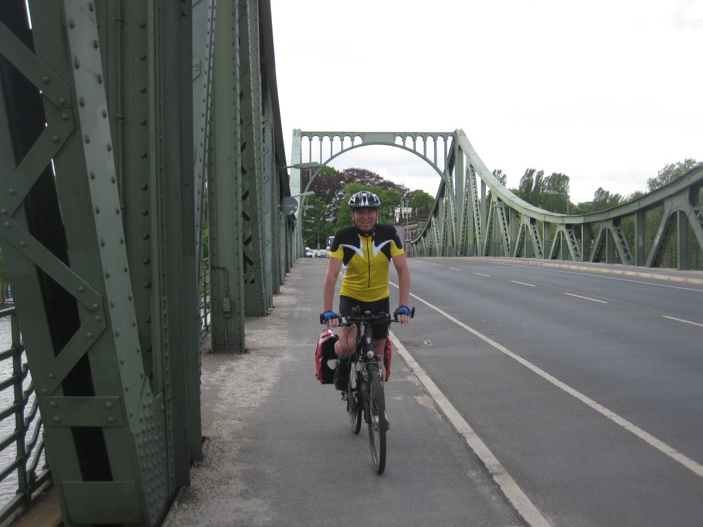 Richtung Berlin trafen wir nun auf historische Orte. Die Strecke führte uns über die Glienicker Brücke (s. links oben). Diese ist aus alten Filmen bekannt, wo gerne Agenten zwischen Ost und West getauscht wurden. Im ehemaligen Westberlin angekommen, ging es nun über einen größeren Hügel zum großen Wannsee. In der Nähe des Strandbads Wannsee bogen wir auf eine reine Fahrradstraße, die parallel zur alten AVUS Rennstrecke und jetzigen BAB115 im Wald schnurgerade ca. 9km in Richtung Funkturm Berlin führt. Beim Zehlendorfer Bahnhof besuchten wir eine beklemmende Gedenkstätte zum Thema Judendeportationen in der Nazi-Zeit. Am Halensee vorbei und mitten durch Charlottenburg fuhren wir zum gleichnamigen Schloss an der Spree. Auf einem sehr
