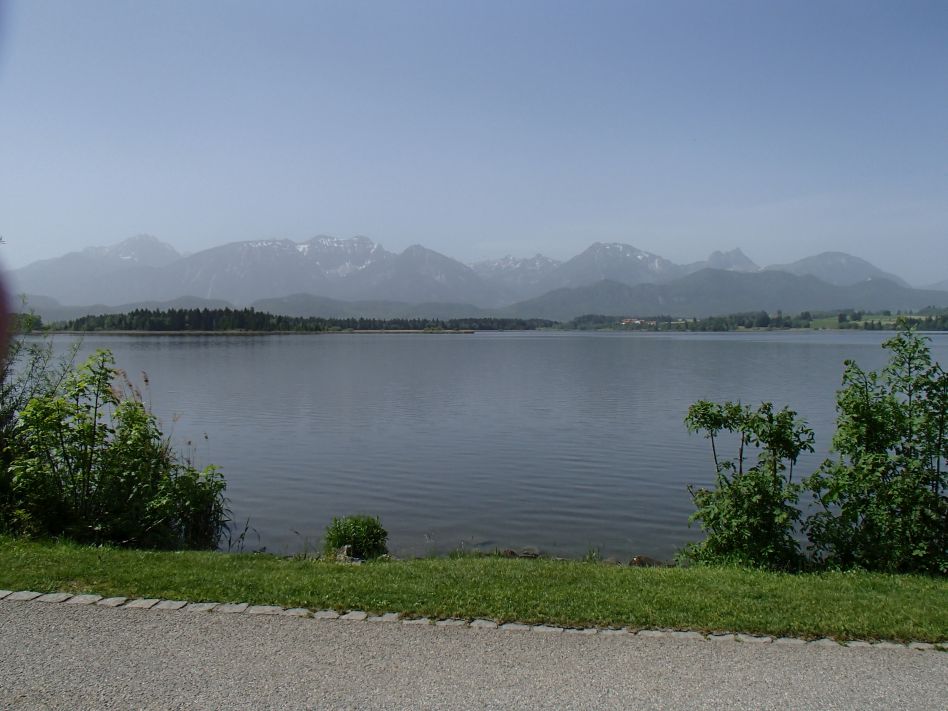 Nach dem guten Frühstück begrüßte uns wieder ein sehr sonniger warmer Morgen. Es sollte ein abwechslungsreicher Tag werden. Ab Nesselwang ging es gleich wieder recht hügelig über ganz schmale Kreisstraßen durch die abgemähten Wiesen des Allgäu. Schon nach wenigen Kilometern kamen wir bei Eisenberg an einer auffälligen Burgruine vorbei. Ab Hopferau verlief die Strecke über einen ziemlich neuen Radweg zum Hopfensee. Dies ist ein kleiner See, der von der Promenade in Hopfen am See einen wunderbaren Blick auf die Alpen (s. links) bietet.
