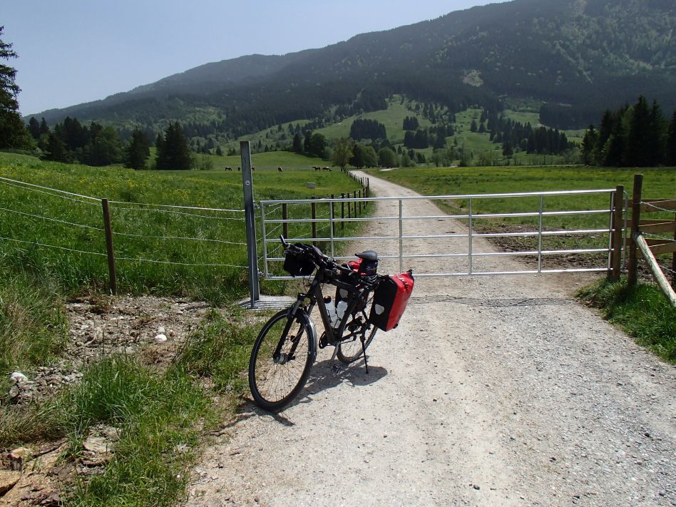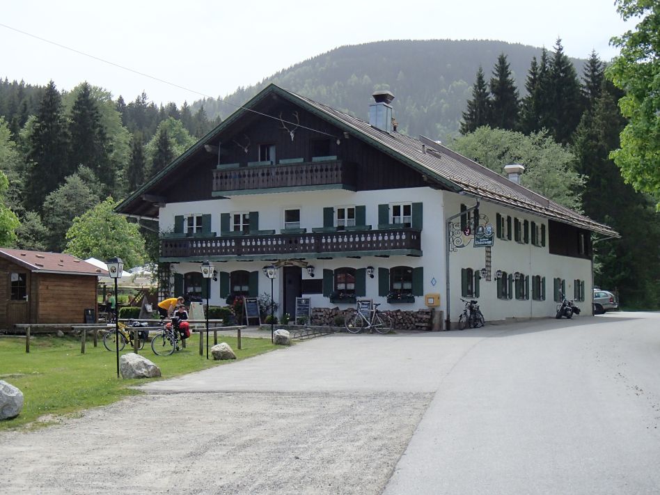 Nun veränderte sich die Wegführung gegenüber unseren bisherigen Erfahrungen. Das erste Mal auf dem Bodensee-Königssee-Radweg mussten wir runter vom Asphalt, und es ging auf geschotterten Pisten weiter. Auch Kuhweiden mit mürrischen Alpenkühen, die den Weg versperrten, galt es zu überwinden. Es war eine ziemlich einsame Gegend. Als wir dann mittags in den Unterammergauer Forst kamen, wurde es richtig einsam. Kilometerlang ging es über Schotterpisten bergauf und bergab, Furten, zum Glück mit Niedrigwasser, waren zu überwinden. Irgendwann kamen mir Zweifel wie lange das noch so weitergehen sollte. Gerade zu richtigen Zeitpunkt tauchte dann auf dem "Königsweg" das Forsthaus Unternogg auf. Derzeit speiste hier König Ludwig, nun gönnten wir uns ein Stück Birnen-Schokoladentorte und füllten unsere Radflaschen mit dem frischen Quellwasser.