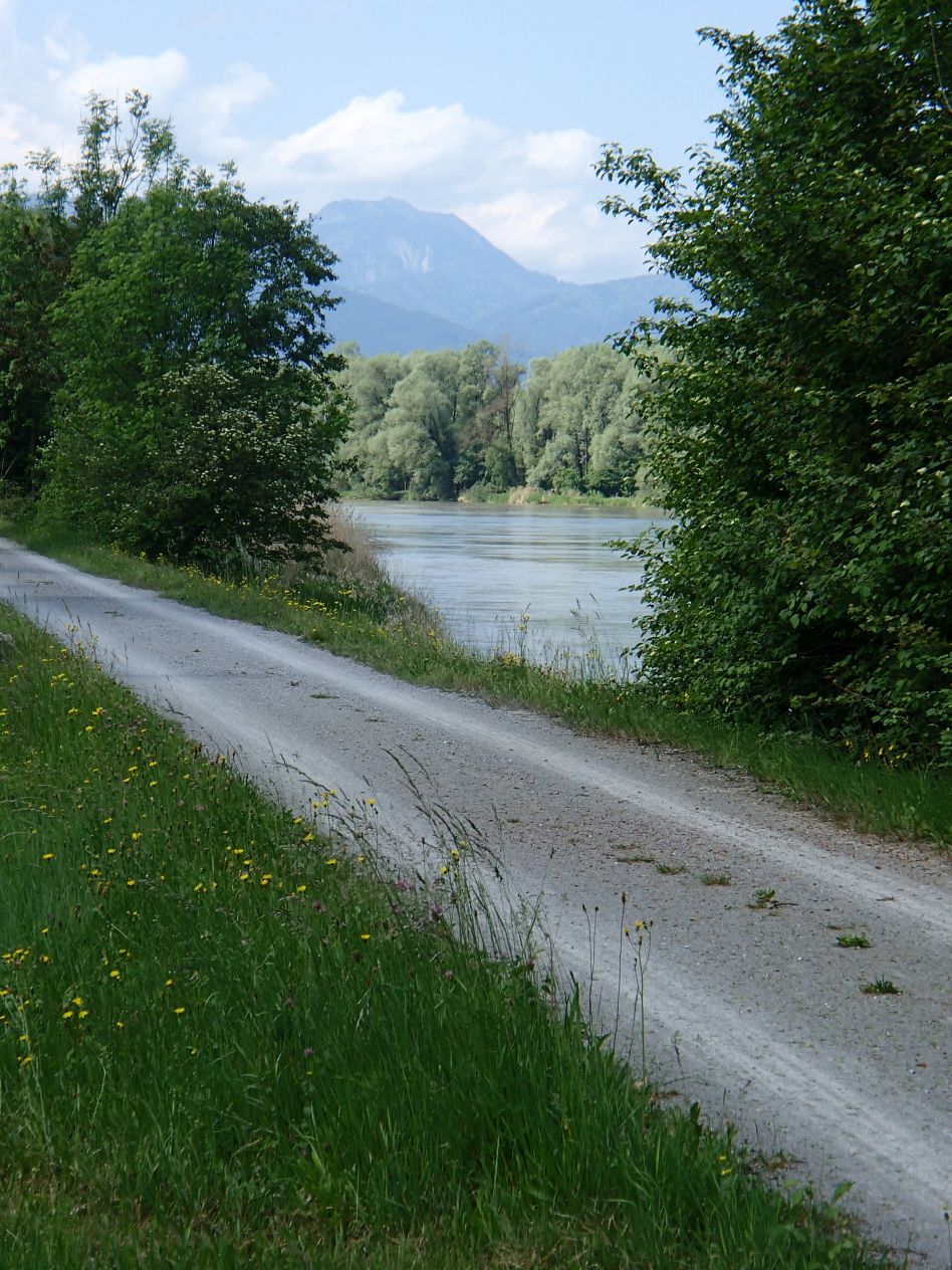 Wir hatten keine gute Nacht, da Magen und Darm rebellierten, vermutlich hatten wir uns bei den stundenlangen Fahrten durch die güllegeschwängerte Luft am Vortag etwas eingefangen. Also frühstückten wir ohne Appetit und entschieden uns für die Fortführung der ursprünglich geplanten Maximalvariante am Inn entlang nach Wasserburg. Am Vorabend hatten wir noch eine Erweiterung um den Chiemsee herum erwogen, da wir sehr gut im Plan lagen. Von der Pension rollten wir herunter an den Inn. Dort wählten wir die rechte Uferseite und pedalierten sehr gemächlich über den flachen Inntalradweg. Das Foto zeigt ganz gut das typische Bild, was sich die meiste Zeit bot.
