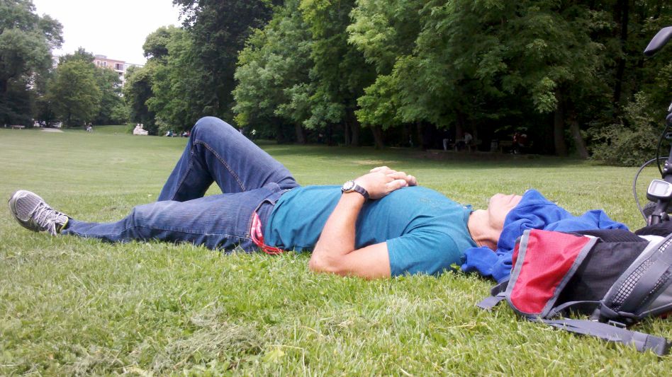 Der Montag war unser Rückreisetag. Da unser Fernbus um 13:00 planmäßige Abfahrt hatte, konnten wir es gemächlich angehen. Wir hatten uns für ein Frühstück in Bogenhausen entschieden. Dort fanden wir eine nette Bäckerei. An den Tischen auf dem breiten Bürgersteig genehmigten wir uns ein Frühstück für zwei. Die kurze Radtour zum Busbahnhof führte uns dann mitten durch München an einigen Sehenswürdigkeiten vorbei. Wir inspizierten schon mal den sehr professionellen Busbahnhof mit übersichtlichen Anzeigen und einem Einkaufszentrum im Obergeschoss. Da wir noch Zeit hatten, fuhren wir zum Bavariapark oberhalb der Theresienwiese. Hier relaxten wir etwas in der Horizontalen, da uns ja eine längere Busfahrt bevorstand.