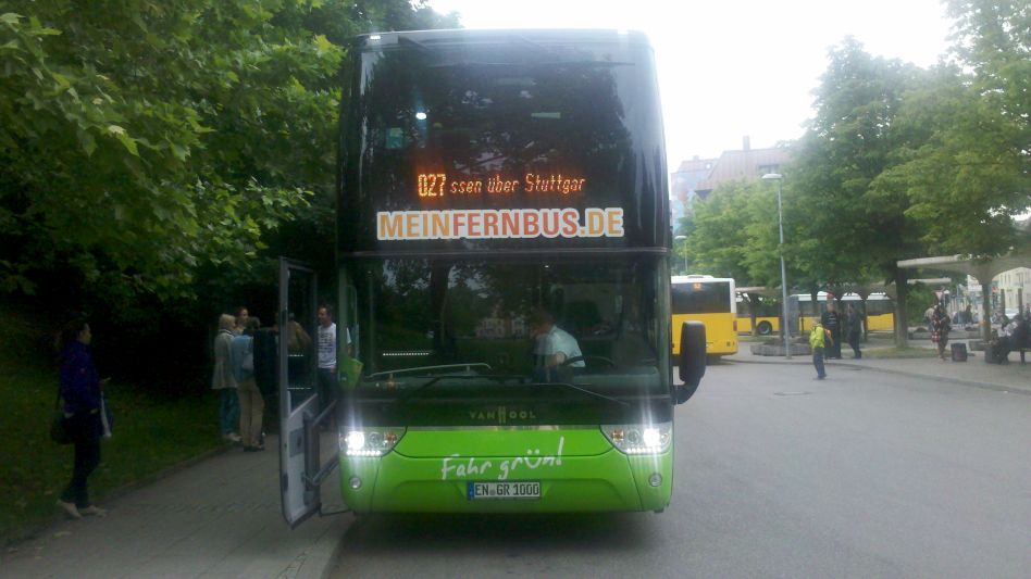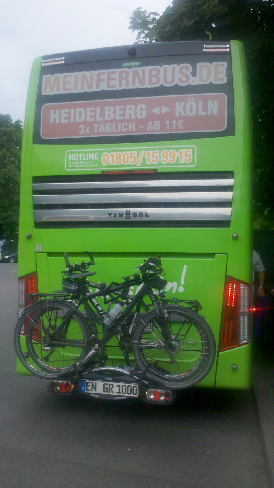Diesmal kam ein sehr moderner Doppeldecker-Bus zum Einsatz. Unsere Räder standen wieder hinten auf dem Radträger und wir fanden gute Sitzplätze im Obergeschoss. Der Fernbus fuhr pünktlich ab und absolvierte jeweils kurze Zwischenstopps in Augsburg, Stuttgart, Karlsruhe, Heidelberg und Mannheim. Pünktlich um 22:30 liefen wir dann in den Kölner Busbahnhof ein, etwas steif von der langen Sitzerei, aber guter Dinge. Wenn man die etwas längere Fahrzeit gegenüber der Bahn in der Planung vorsehen kann, dann ist die Reise mit dem Rad im Fernbus eine sehr bequeme und kostengünstige Variante.