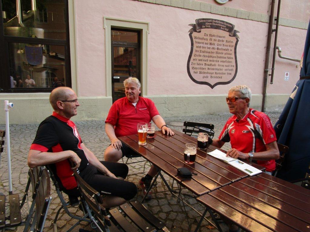 Der Willi strebte unaufhaltsam der Zwangspause im Kloster Weltenburg am Donaudurchbruch entgegen. Vorher waren hinter Kehlheim jedoch 130 steile Höhenmeter zu überwinden (s. Höhenprofil), der einzige nennenswerte Anstieg des Tages. Ich muss zugeben wir besuchten das Kloster Weltenburg aus sehr weltlichen Gründen. Die Schenke zog uns an, durstig wie wir waren, nach der heißen Bahnfahrt und der staubigen Radtour an der Donau. Seit dem Jahr 1050 wird hier schon Bier von Benediktinern gebraut, das uns allen gut schmeckte (s. links).