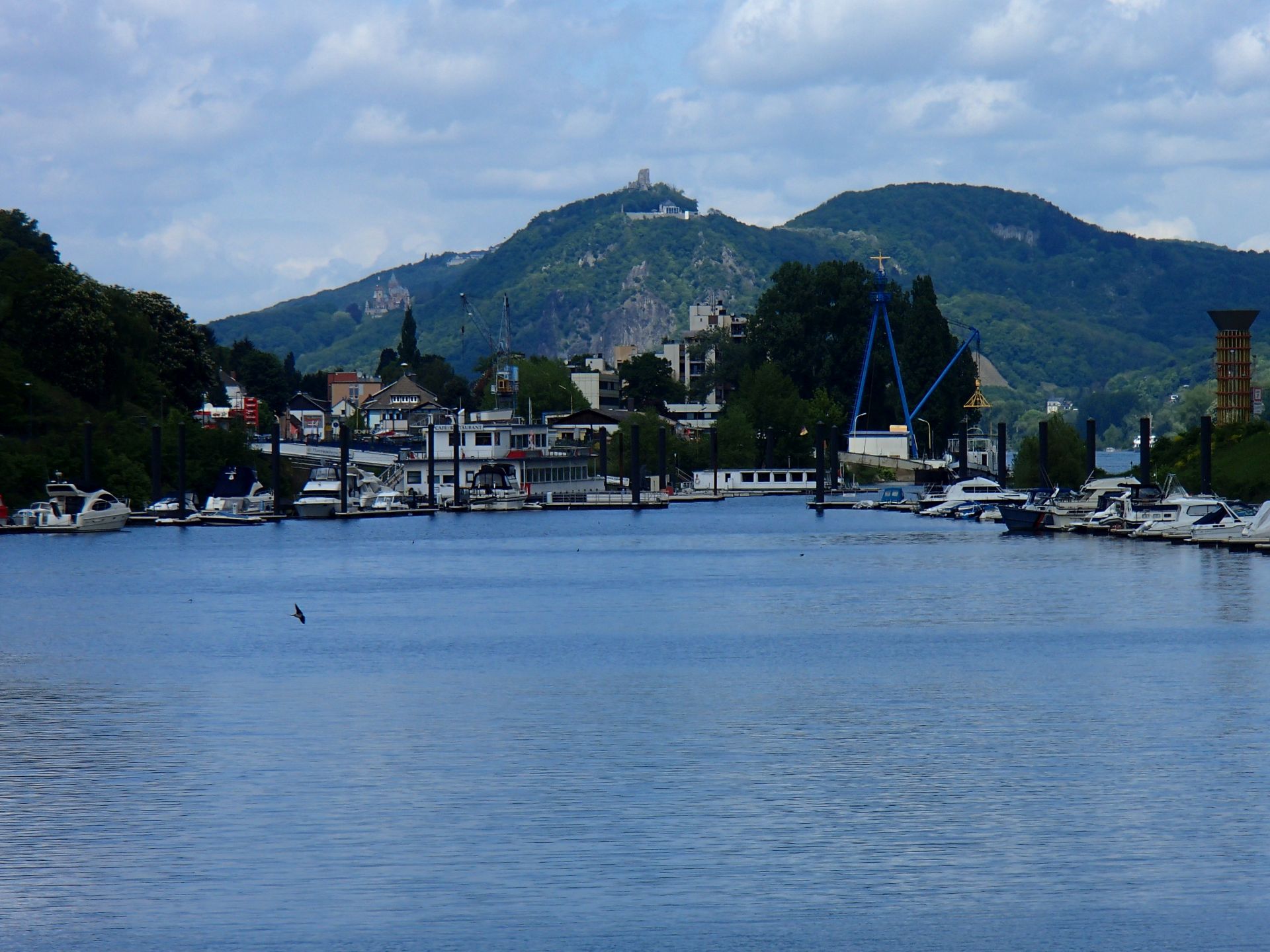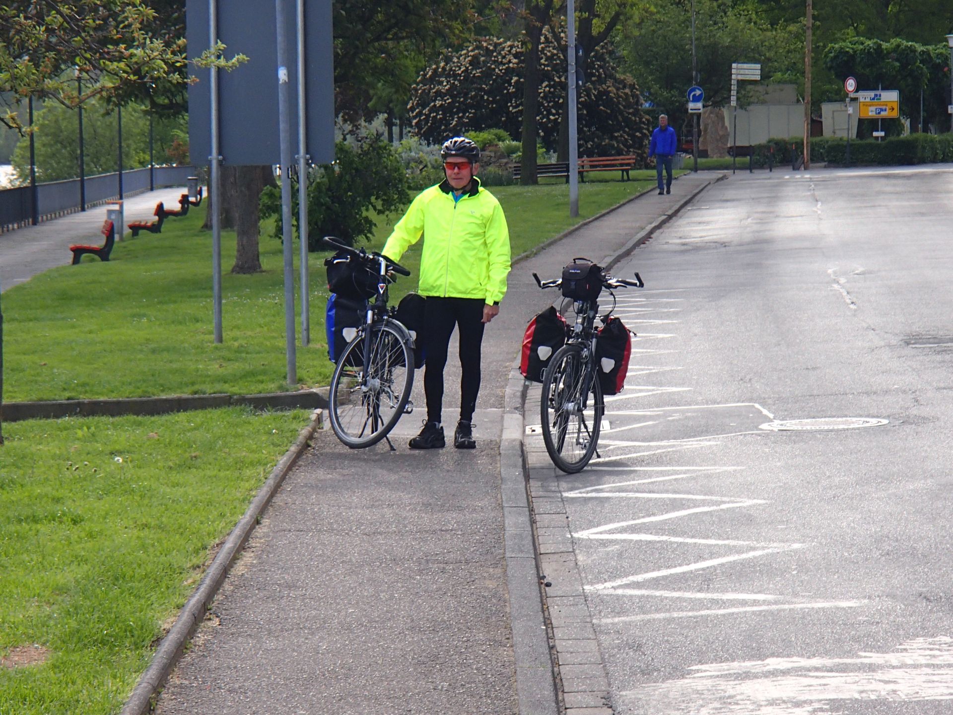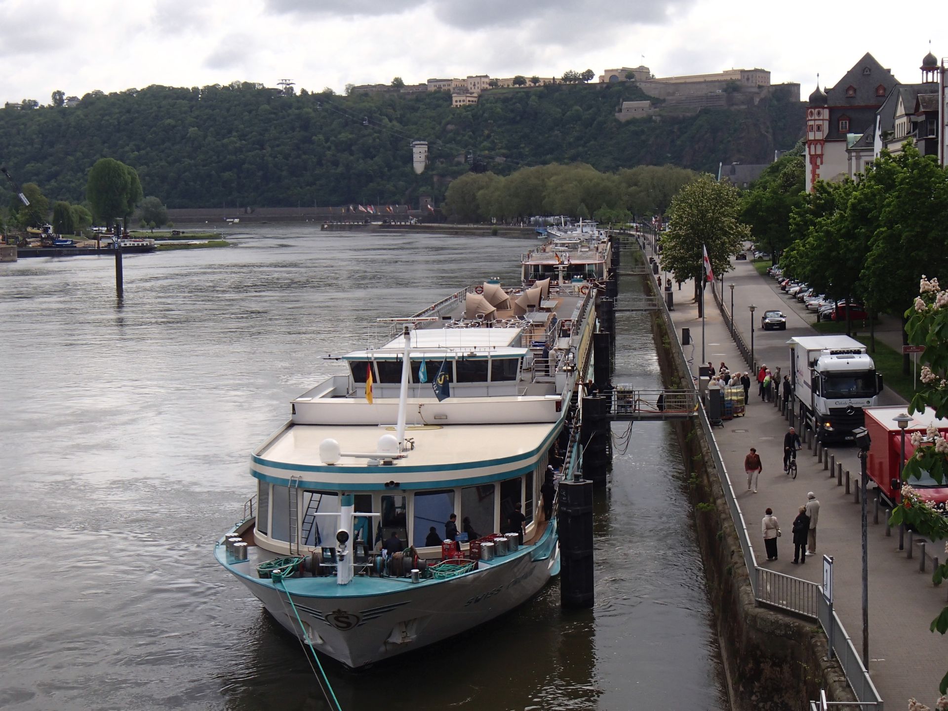 Im riesigen Speisesaal waren wir morgens fast allein beim Frühstück, das alles bot was wir benötigten. Links sieht man, dass der Karl danach seine wärmsten Sachen anzogen hat, denn es war immer noch empfindlich kalt. Das Sitzfleisch hatte nach den 7,5 Stunden des Vortags auch deutlich gelitten. Noch wussten wir natürlich nicht, dass es an diesem Sonntag 8,5 h auf dem Rad und 135 km Strecke werden sollten, bis wir das heimische Kerpen erreichten sollten. Mit kontrollierter Offensive fuhren wir los und wechselten uns im Gegenwind ab. Bei Lahnstein ließen wir die Lahnmündung rechts liegen und erreichten bald die Außenbezirke von Koblenz. Hier rollten wir gemütlich über die schon gut besuchte, schöne Promenade des ehemaligen BuGa Geländes. Wir überquerten die Mosel mit Blick auf die Ausflugsschiffe und die Festung Ehrenbreitstein (s. links).