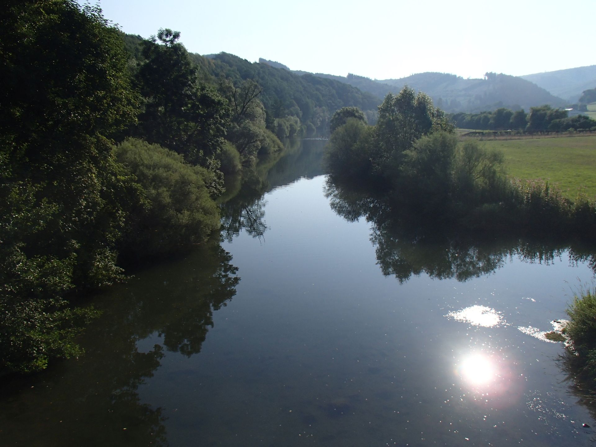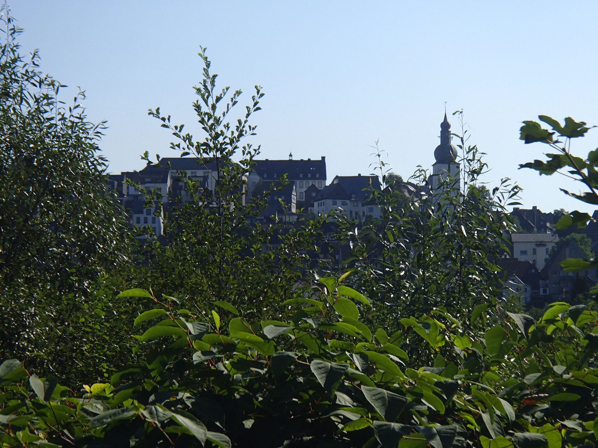 Unser Zimmer im Hotel Luckai hatte sich in den vorausgehenden Tagen schon recht gut aufgewärmt, so dass wir nicht besonders gut erholt am Frühstückstisch auftauchten. Auf dem Plan für die Tagesetappe standen kaum Höhenmeter, da wir die Ruhr, wie die meisten anderen Ruhrradler von der Quelle zur Mündung begleiteten. Allerdings hatten wir knapp 140 km vor der Brust. So wie bei unseren Touren üblich saßen wir zwischen 8:30 und 9:00 auf den Rädern um auch bald direkt neben der Ruhr zu radeln. Schon nach wenigen Kilometern tauchte die Verwaltungsstadt Arnsberg (s. links Mitte) am Horizont auf. Die Lage auf einer Anhöhe ist von allen Seiten imposant. Die Ruhr verführt hier eine 180° Kehre und erzeugt sozusagen eine Ruhrschleife, eine sehr beeindruckende Landschaft noch tief im Sauerland. Die darauf folgenden Orte Hüsten und Neheim fanden wir langweiliger, da es zum Teil auch etwas weiter entfernt von der Ruhr durch Gewerbegebiete ging. Wir hatten kurz danach bei Wickede schon die ersten 40 km hinter uns. Wegen des heißen Wetters fuhren wir ein Cafe im Ort, um uns etwas zu stärken und die bereits deutlich gelehrten Wasserflaschen wieder zu füllen.