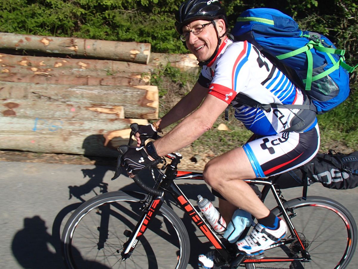 Auf dieser Etappe waren uns keine ebenen Abschnitte vergönnt. Es ging permanent rauf oder runter mit ständig wechselnden Gradienten. Der Streckenverlauf und das häufige kurze Anhalten erlaubte es nicht in eine gleichmäßigen Rhythmus zu kommen. Die Landschaft, das tolle Wetter und die kleinen verkehrsarmen Nebenstraßen entschädigten für die anspruchsvolle Strecke. Nach 37 Kilometern hatten wir schon einige Höhenmeter gesammelt, aber immer noch keinen ordentlichen Kaffee getrunken. Nach einer rasanten Abfahrt ins Tal der Ourthe erreichten wir das Dorf Rendeux in der Provinz Luxemburg. Hier fiel uns ein kleiner Supermarkt ins Auge. Wir versorgten uns mit frischen Brötchen, aber einen Kaffee gab es auch hier nicht. Wir überwanden die nächste Hügelkette (s. links) und hatten im folgenden Flusstal eine ungewöhnliche Verkehrsführung über eine Schnellstraße zu meistern. Nach 60 km gingen unsere Wasservorräte so langsam zur Neige, doch statt einer Einkehr folgte zur Unzeit ein knackiger über 6 Kilometer langer Waldanstieg auf über 500 Meter Höhe. Oben angekommen teilten wir das verbliebene Wasser auf. Leider brachte die folgende lange Abfahrt keine Erholung, da es sich um eine Schlaglochstrecke handelte.