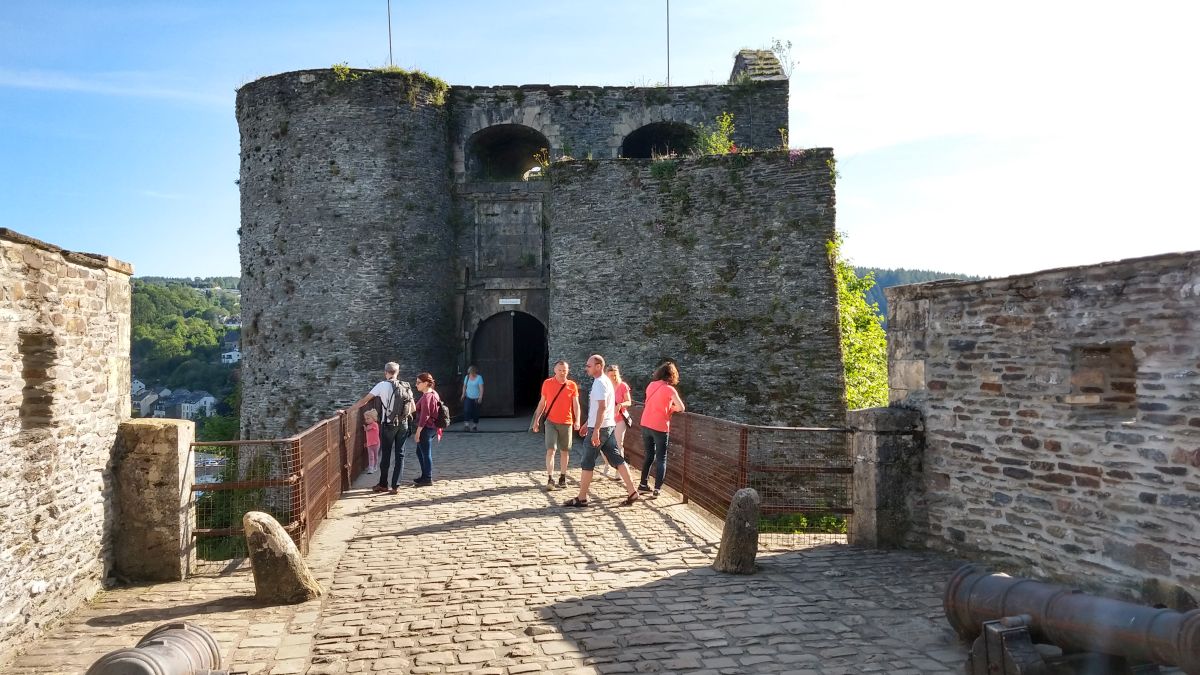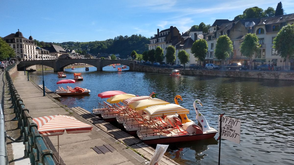 Auf den folgenden 30 Kilometern ging das Streckenprofil immer mehr in eine wellige Hochfläche über, so das wir besser vorankamen. Kurz vor dem Tagesziel wählten wir in Curfoz doch noch die falsche Straße, die uns allerdings ungewollt zu einem schönen Aussichtspunkt über der Stadt Bouillon führte. Um zu unserem Hotel zu gelangen stürzten wir uns eine steile Schotterpiste durch den Wald hinunter, was noch mal höchste Konzentration erforderte. Der finale Schock des Tages war dann die Aussage des Hoteliers, dass die Räder auf der Straße bleiben müssen, da im Hotel kein Platz sei. Das war allerdings keine Schikane sondern verständlich, da das Hotel nur zwei Zimmer hatte, je eins pro Obergeschoss. Unser Zimmer war ungewöhnlich, aber sehr liebevoll gestaltet und mit dem Wasserkocher konnten wir sehr geschmackvollen Cappuccino herstellen und uns am vorgekühlten Wasser bedienen. Nachdem wir geduscht hatten, setzten wir unsere junge Tradition der Stadtbesichtigungen fort. Wir verbrachten einen wundervollen Abend in der sehr touristischen Innenstadt im Schatten der Burg von Gottfried von Bouillon, erster christlicher Regent von Jerusalem. Wir schlenderten an beiden Ufern der Semois durch den Ort und nahmen auch noch den Aufstieg zur Burg in Angriff, der herrliche Ausblicke auf Stadt und Umland bot. An diesem schönen Sommerabend stärkten wir uns in einer kleinen Pizzeria an der Flusspromenade und genossen das mediterrane Flair des Abends. Dann banden wir unsere Rädern noch mal an einem Straßenschild fest und hofften darauf sie am nächsten Morgen wieder zu sehen. Der bemühte Hotelier hatte uns auch versichert es wäre "safe" vor dem Hotel.
