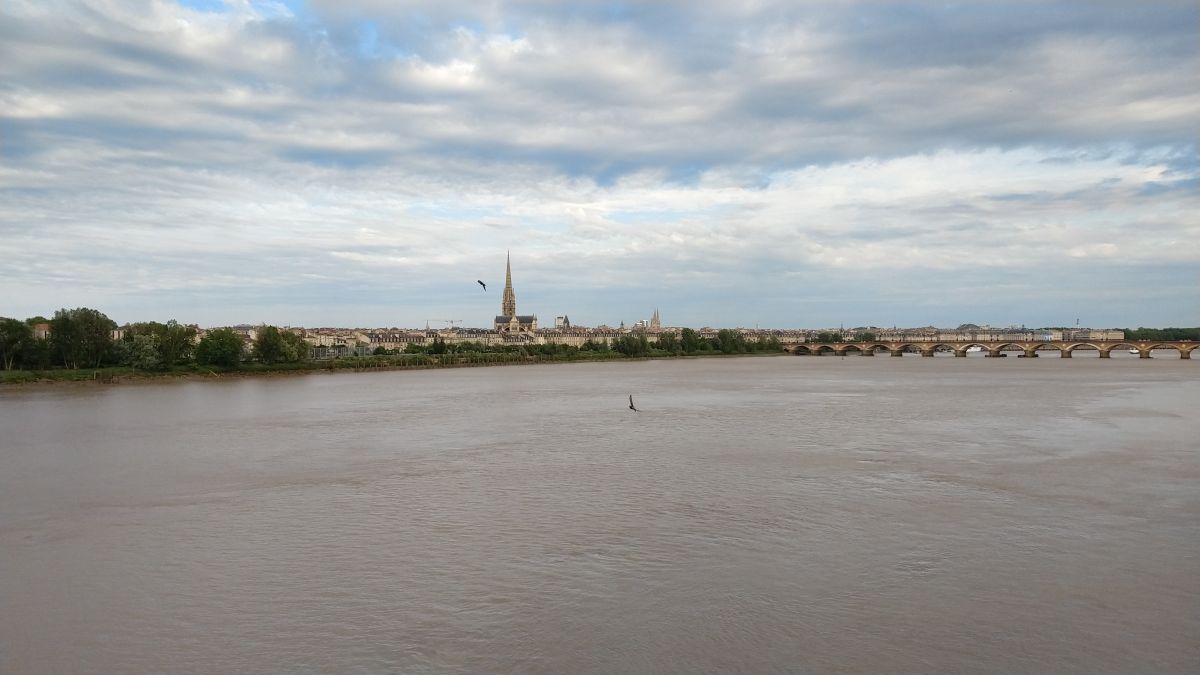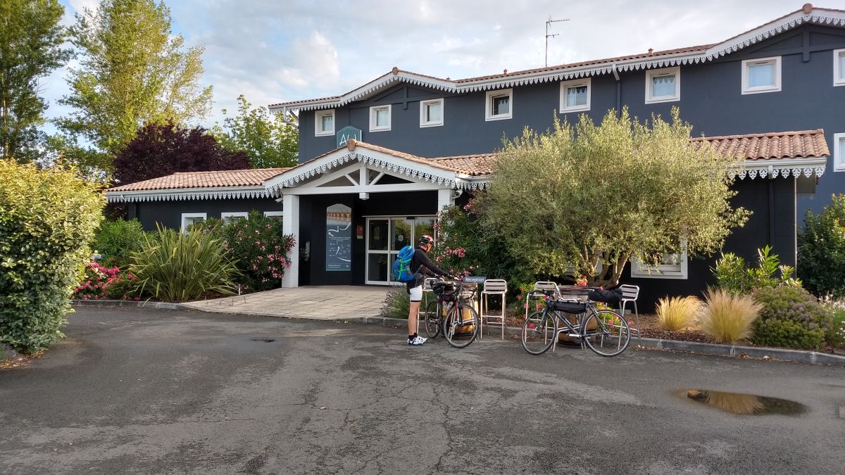 Als wir morgens das Hotel verließen stellten wir fest, dass es in der Nacht wohl kräftig geregnet hatte. Es war mit 15 Grad recht frisch und die Straßen auch noch nass, wie man auf dem Bild vom Vorplatz des Hotels gut erkennen kann. Wir zogen uns an diesem Sonntag Morgen die Windjacken an, ehe wir uns auf die 128 Kilometer dieses Tages begaben. Mit einem Schnitt von mehr als 24 km/h sollte es unsere "schnellste" Etappe werden, was außer der steigenden Formkurve vor allem an den Bedingungen lag. Der Tag gestaltete sich sonnig und trocken mit häufigem Rückenwind und der Kurs war insgesamt recht einfach zu fahren, wie wir gleich sehen werden. Allerdings hatten wir erst mal eine Problem zu lösen. Die Navigation wollte uns über nahe Autobahnbrücke schicken. Es kann sein, dass es da einen Radweg gab, wir fanden in jedenfalls nicht und nahmen ein kleinen Umweg über die nächstgelegene Brücke, in der Nähe des Zentrums von Bordeaux in Kauf. Auf dem Weg dahin fiel uns direkt hinter dem Ortschild der Stadt Bordeaux, mitten in einem hässlichen Industriegebiet am Ufer der Garonne, ein Groß-Bäckerei ins Auge. Hier konnte wir uns in aller Ruhe unser Standard Frühstück genehmigen. Die Croissants war lecker, der Kaffee leider nur aus dem Automaten. Kurz danach führte uns der Radweg auf die Brücke Pont Saint Jean und über die Garonne. Wir saugten den morgendlichen Anblick (s. links) der neunt größten Stadt Frankreichs und der schon sehr breiten Garonne in uns auf. als wir alles wieder verstaut hatten, tauchten wir in den westlichen Teil von Bordeaux ein. Allerdings hatten wir keine Zeit und Lust uns mit den Sehenswürdigkeiten von Bordeaux zu beschäftigen. Auf ziemlich leeren Straßen rollten wir aus der Großstadt heraus und durch die dörflichen Vororte, in der Nähe des Flughafens vorbei, immer in Richtung Süden. Kurz hinter dem Flughafen erreichten wir die Grenze des Naturpark der Gascogne, nach eigenen Angaben das größte zusammenhängende, ursprüngliche Waldgebiet Europas. Kurz bevor wir richtig in dies Gebiet eintauchten, erreichten wir den kleinen Ort Saucats. Es war kurz vor 10 Uhr und wir hatten schon fast 30 Kilometer auf dem Tacho. Wir fanden es war Zeit für eine zweites Frühstück mit Käse und Baguette und einen richtigen Kaffee. Diese Pause war auch im Nachhinein eine gute Entscheidung, denn auf den nächsten 50 Kilometern fanden wir außer Straßen keinerlei andere Infrastruktur vor.