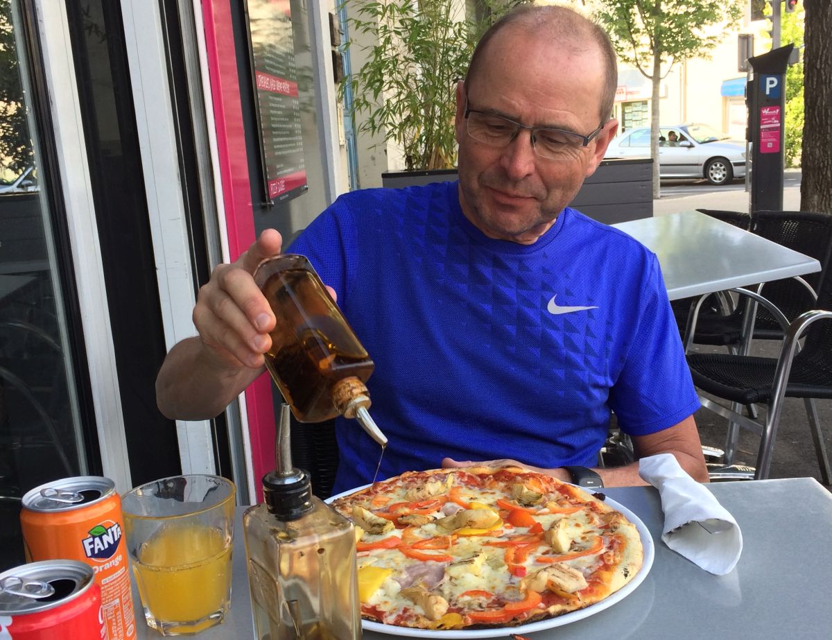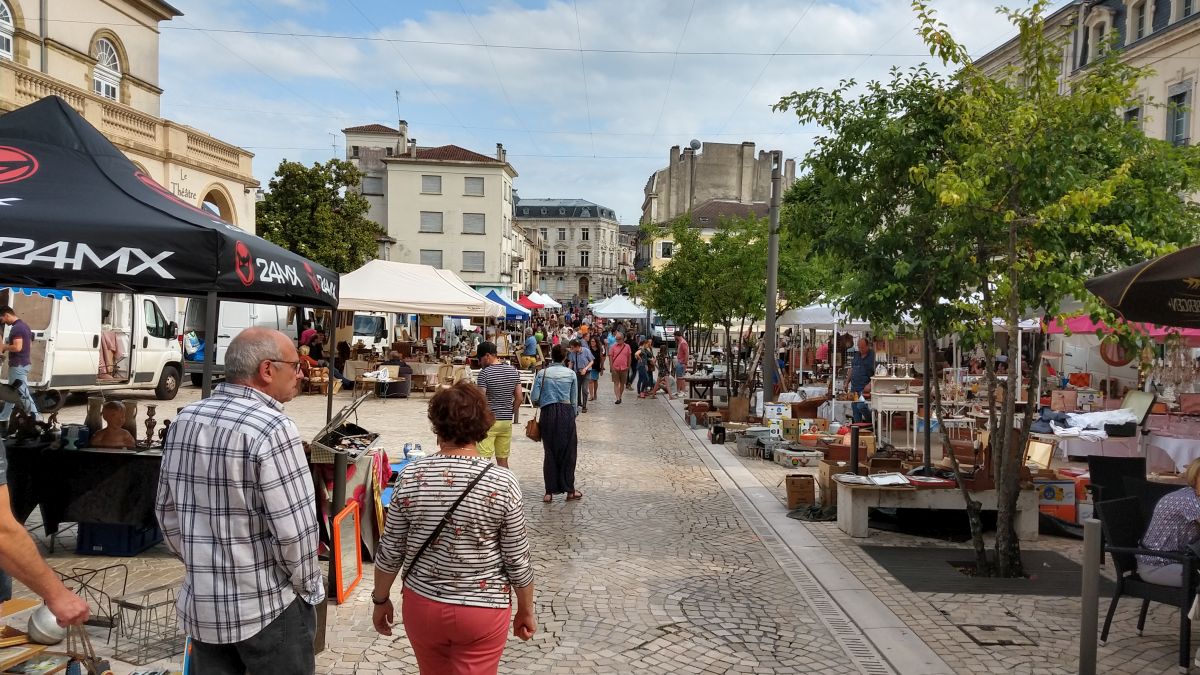 Das nette Hotel war privat geführt und wir erhielten ein sehr ruhiges Zimmer mit Blick in den schönen Garten. Als wir uns geduscht auf den Weg ins Stadtzentrum begaben, wies uns der Hotelier auf den großen Flohmarkt im gesamten Stadtzentrum hin. Mont de Marsan erwies sich als sehr sehenswert. Der Flohmarkt bot den Besuchern eher Antiquitäten als Plunder an, es wirkte fast alles recht stilvoll, bis auf die miserable Heavy-Metal-Livemusik. Wir schlenderten durch die schattigen Gassen und an den Ufern der Flüsschen Midou und Douze entlang, die sich mitten im Ortszentrum zur Midouze vereinigten. Hier fanden wir an einer Brücke die beeindruckende Skulptur eines Wasserspringers installiert. Zwei bekannte Bildhauer stammen aus dem Ort, denen auch ein Museum in einer alten Festung gewidmet ist. Irgendwann konzentrierten sich unsere Blicke aber mehr auf Speisekarten, der immer noch geschlossenen Restaurants. Direkt gegenüber unserem Hotel rüttelten wir an der Tür einer kleinen Pizzeria. Die Pizzabäcker hießen uns schon ganz selbstverständlich willkommen, obwohl die Bedienung noch gar nicht eingetroffen war. Wir genossen im Schatten vor der Pizzeria sehr gute südfranzösische Pizzas (Quattre Maison), ehe wir uns rundum zufrieden auf unser Zimmer begaben.