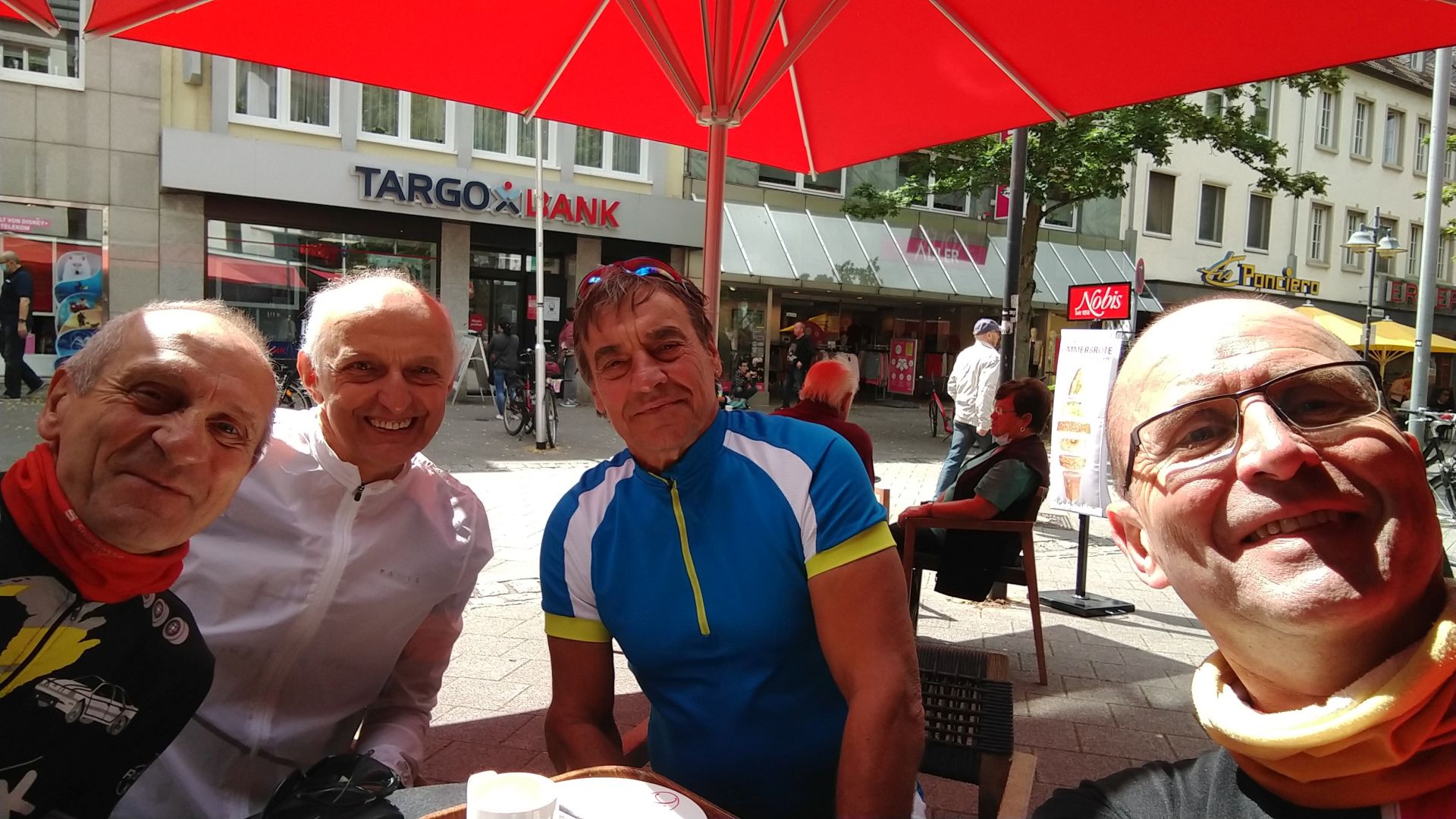 Westlich des Hambacher Tagebaus suchten wir erfolgreich etwas Windschutz bei der Durchquerung der Dörfer Oberzier, Niederzier, Hambach und Stetternich, die wie an einer Perlenschnur aufgereiht lagen und ohne störende Ampeln locker durchfahren werden konnten. Ab Stetternich bogen wir auf die Trasse der alten römischen Heerstraße Via Belgica ein, die uns auf einem Westkurs bis mitten ins Zentrum von Jülich führte. Wir stellten unsere Räder in der Nähe der sehr guten erhaltenen Zitadelle ab und fanden einen schönen Tisch für die traditionelle Kaffee-und-Teilchen-Pause, die zu jeder Klickfööss-Tour gehört.