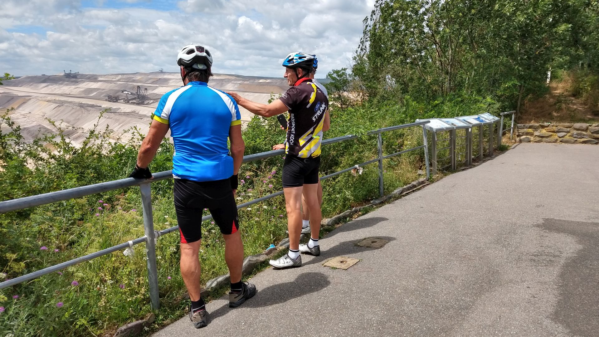 Gestärkt durch die Pause und unterstützt durch den kräftigen Westwind erhöhten wir nun deutlich das Tempo. Über Wirtschaftswege und sehr kleine Kreisstraßen passierten wir die Dörfer Pattern, Güsten, Rödingen, Bettenhoven und Oberembt, alles nahezu verkehrsfrei und immer mit freiem Blick auf die mächtige Sophienhöhe (die leider keine asphaltierte Rennrad Rampe enthält). Bei Elsdorf-Esch erreichten wir dann die Grubenrand-Straße und besichtigten bei besten Sichtverhältnissen den beeindruckenden Tagebau, von einem gut gestalteten Aussichtspunkt aus. Über den guten Radweg der verlegten Bundesstraße 477 erreichten wir die neue Autobahnausfahrt Elsdorf und rollten kurz danach an Neu-Manheim vorbei zum Ausgangspunkt der Tour zurück. Die "Kölner" freuten sich über die Abwechslung und wir verabredeten uns zu weiteren Touren.