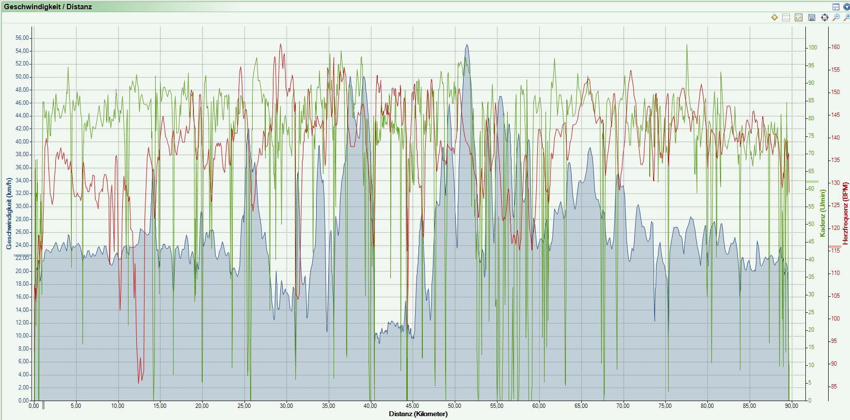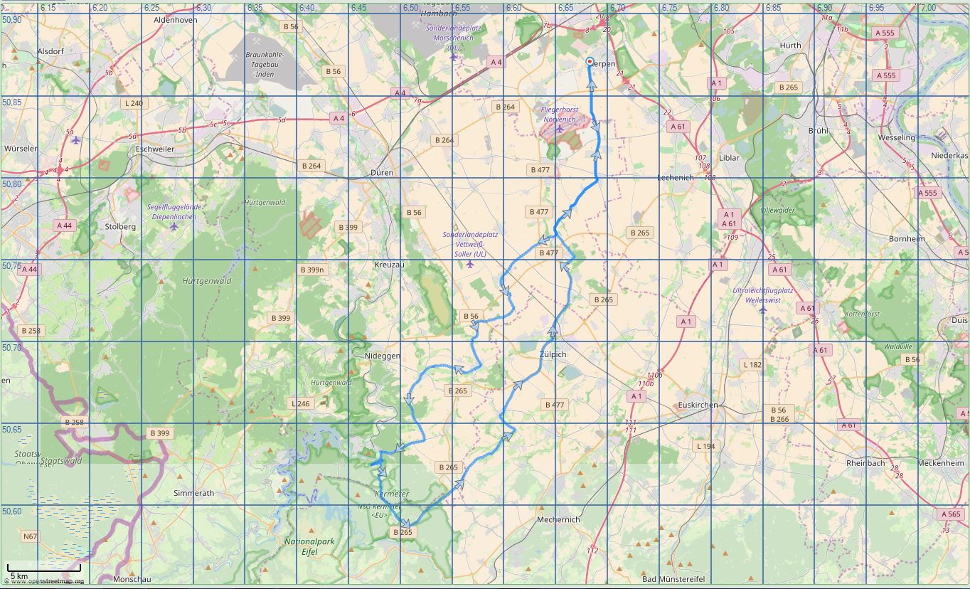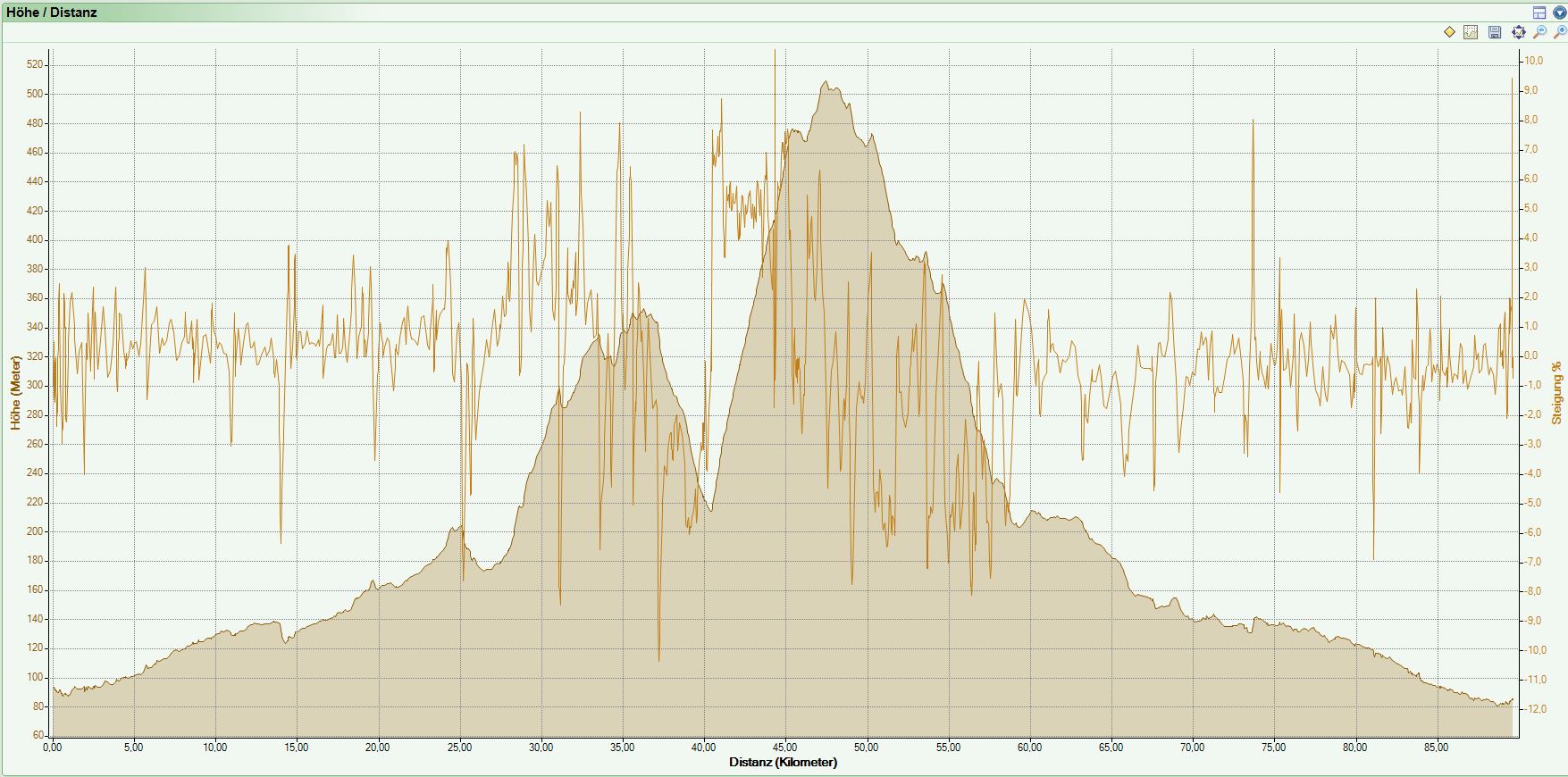 Hinter Mariawald folgten noch ein paar Höhenmeter, ehe wir kurz vor Wolfgarten die 500 Meter Höhenlinie überquerten und bald danach die Bundestraße 265 erreichten. Nun folgte der Teil, der mir als Rolleur am meisten liegt, etwa 40 Kilometer bis zum Ende weist die Strecke mehr oder weniger steiles Gefälle auf und ist ein Genuss zu fahren. Auf der sehr breiten B265 konnten wir bis Güttling richtig Tempo machen und Jens und ich uns auch an das veränderte Fahrverhalten unserer Räder gewöhnen. Über das andere Berg (Mechernich), Bürvenich, Langendorf und Zülpich erreichten wir heimisches Gelände.