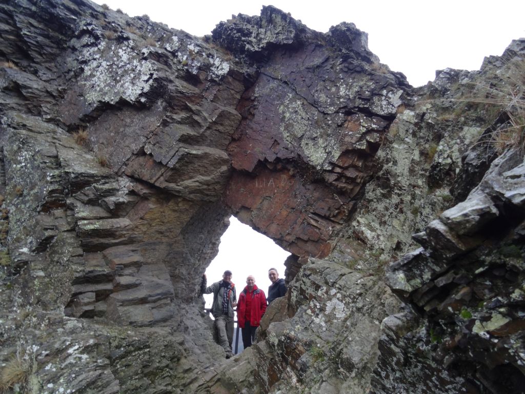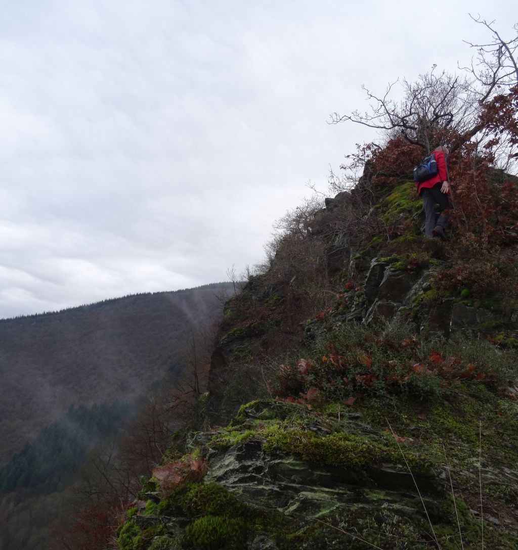 Schon bald erreichten wir das spektakuläre Teufelsloch (s. links oben), eine markante Felsformation mit tollem Blick auf die Ahrschleifen und Kreuzberg von beiden Seiten des Lochs aus. Nach kurzer Verschnaufpause ging es auf einem schmalen Pfad anspruchsvoll bergab. Auch das Schwarze Kreuz auf dem Weg ins Tal gingen wir an, um den Blick auf Altenahr zu genießen. Nach einer kurzen Stippvisite im Ahrtal folgte der lange Aufstieg zu einem der spektakulärsten Punkte des Ahrtals, dem Teufelsley (s. links). Hier wird es schon etwas alpin was die Steilheit angeht, auch ist gute Trittsicherheit und Schwindelfreiheit unabdingbar wenn man den Steig ganz passieren will. Wir verzichten aus Sicherheitsgründen auf den Grat und das folgende letzte Steilstück, da die Felsen an diesem Morgen noch recht feucht und glatt waren. Als mussten wir wieder etwas absteigen, um dann den ordentlichen Aufstieg zum höchsten Punkt des Tages in Angriff zu nehmen. Vom Schrock aus hatten wir einen guten Blick auf eine Ahrschleife und Mayschoss in der Ferne. Die Schutzhütte kam gerade recht, da wir vom Anstieg durchgeschwitzt waren, und den schönen Ort zu einer späten Frühstückpause nutzten.