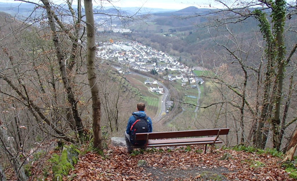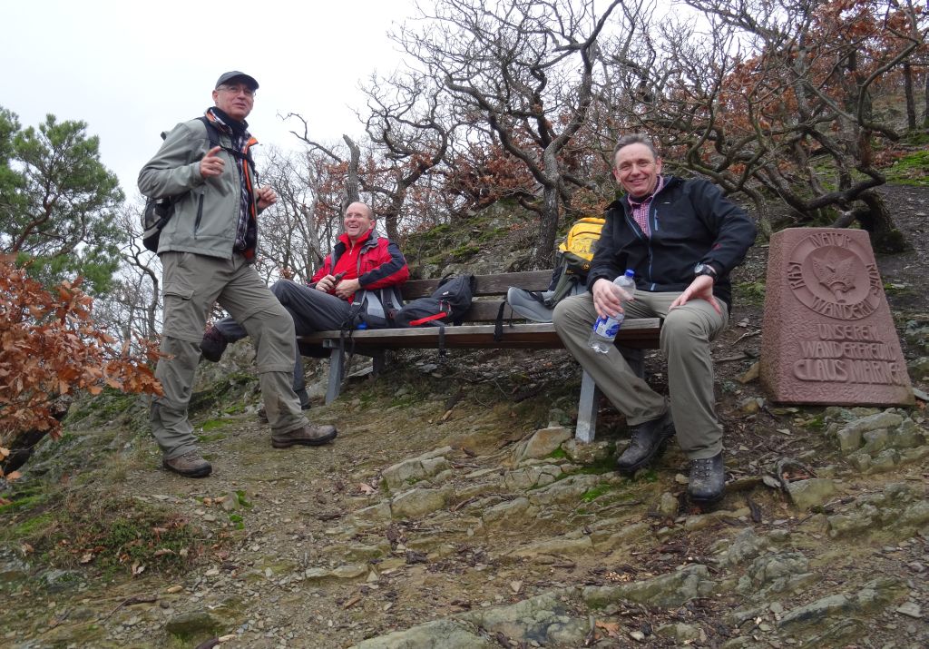 Noch am Vortag hatte es bis weit in die Nacht heftig geregnet. Zum Glück war es dann morgens trocken und wir konnten für die Jahreszeit mit dem Wetter recht zufrieden sein. Es blieb trocken bei maximal 9°C und fast völliger Windstille. Erfreulicherweise handelte es sich bei unserer Wanderroute um eine Einwegstrecke. Das Ziel der Anfahrt mit dem Auto war der Bahnhof von Walporzheim. Der Bernhard organisierte schnell eine Fahrkarte für unsere Minigruppe. Die Ahrtalbahn fuhr pünktlich auf dem einzigen Gleis ein und nach kurzer Fahrt erreichten wir Kreuzberg, den Startpunkt der Wanderung. Diese begann nun mit einem lockeren Eingehen durch den verschlafenen Ort, an einigen für immer geschlossenen Hotels vorbei. Nachdem wir die Seniorenresidenz und das Schulzentrum passiert hatten, ging es endlich steil bergauf.