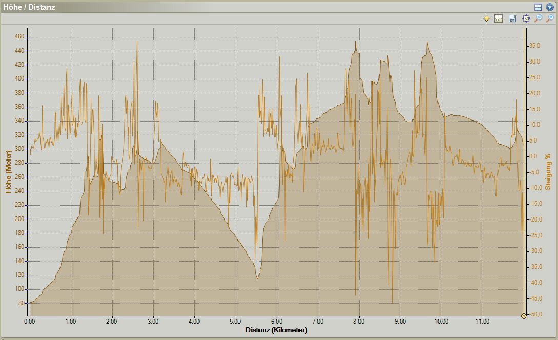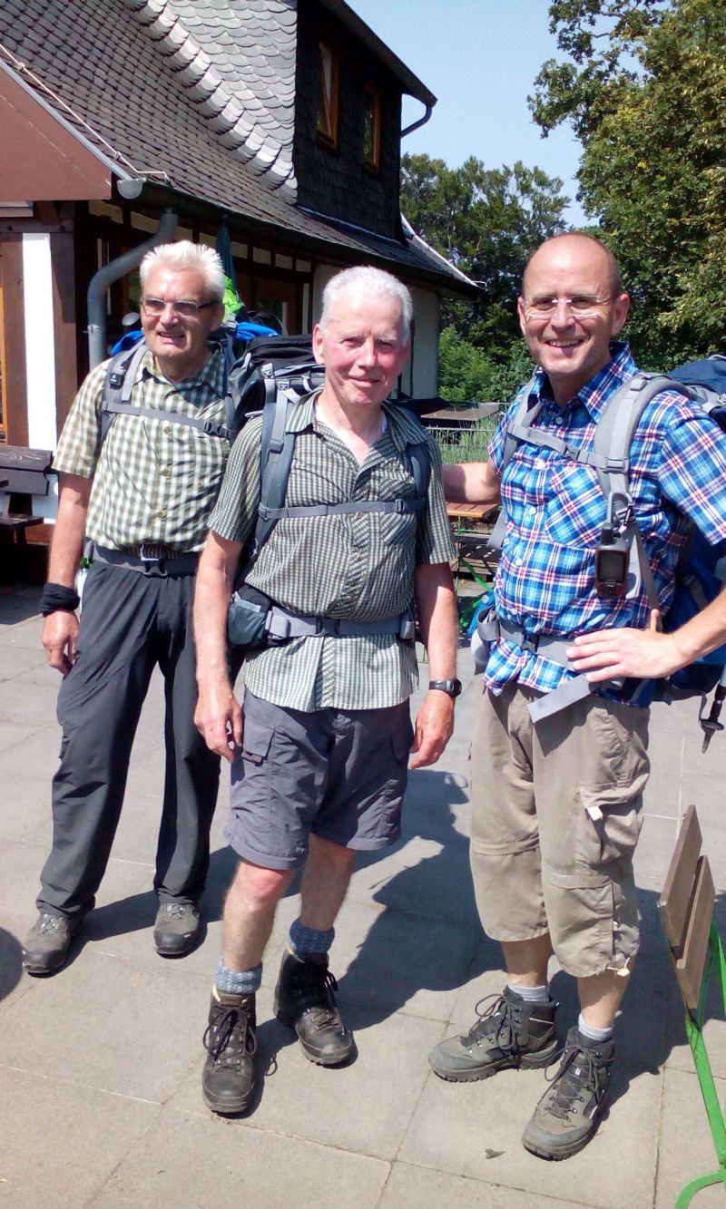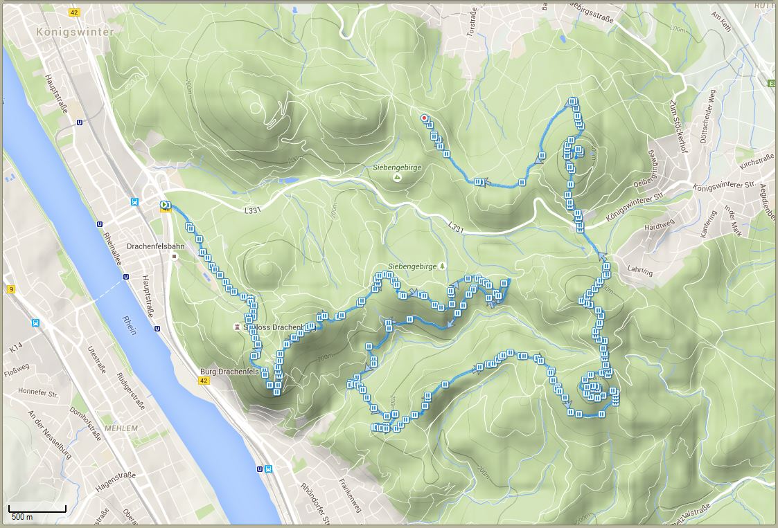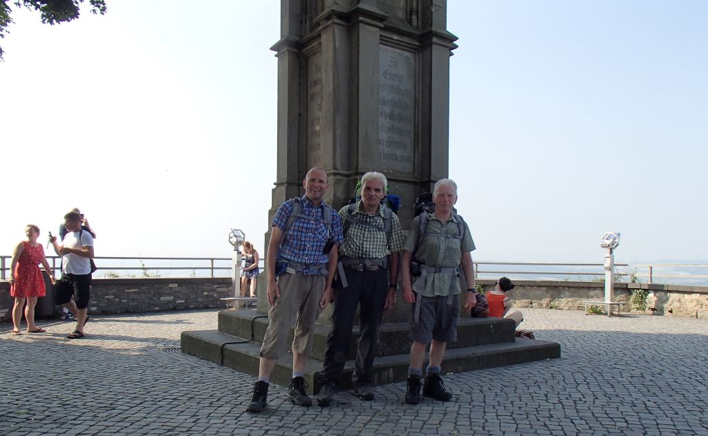 Trotz allem war es natürlich heiß und schon nach dem ersten Anstieg zum Drachenfels waren wir alle gut verschwitzt. Nach der Löwenburg testeten wir mal die dortige Gastronomie, das alkoholfreie Weißbier war optimal gegen den Durst. Ohne allzu lange Pausen ging es weiter. Den Großen Ölberg hinauf nahmen wir die steile Variante, oben angekommen ging es nach dem Gipfelfoto (links unten) bald wieder hinab. Wir kürzten die Runde leicht ab, durch den Wegfall des finalen Aufstiegs zum Petersberg. Nach 1200 Höhenmeter auf und ab und 25,8 km Gesamtstrecke erreichten wir stolz den Wagen bei sehr schwülen Bedingungen im Rheintal. Wir hatten alle drei sehr ordentlich geschwitzt und mussten im Laufe des Abends noch einiges trinken. Es blieb das gute Gefühl, für die Alpenquerung ganz ordentlich gerüstet zu sein. Die Rucksäcke waren gut zu tragen, die Fußsohlen blieben abermals blasenfrei und das Navi kam mit einer Akkuladung mehr als locker über den Tag.