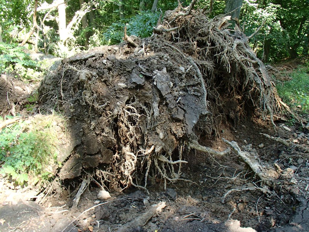 Dieser große kostenlose Parkplatz ist ein hervorragender Ausgangspunkt für Wanderungen, da er schon etwas höher liegt als der Talboden. Mit dem langsamen gleichmäßigen Schritt, den ich mir in den Alpen angewöhnt hatte, ging es zuerst an der Mauer des Klosters entlang. Danach folgte ein längerer recht gleichmäßiger Anstieg bis zum Joch zwischen dem Petersberg und dem Nonnenstromberg. In einigen Kehren folgten wir der Rheinsteigbeschilderung über den Nonnenstromberg. Auf dem absteigenden Teil lagen einige frisch entwurzelte Bäume im Weg (s. links). Hier hatte ein Unwetter in den letzten drei Wochen wohl einiges Unheil angerichtet. Auf dem Weg in Richtung des Großen Ölbergs statteten wir der Ruine Rosenau noch einen kurzen Besuch ab. Wir hielten uns nur kurz in der knalligen Sonne auf und suchten danach wieder den Schatten. Dann wurde es immer steiler, je näher wir dem Gipfel des Ölbergs kamen. Im ruhigen Schritt und mit der einen oder anderen Pause war der Anstieg aber gut zu schaffen.