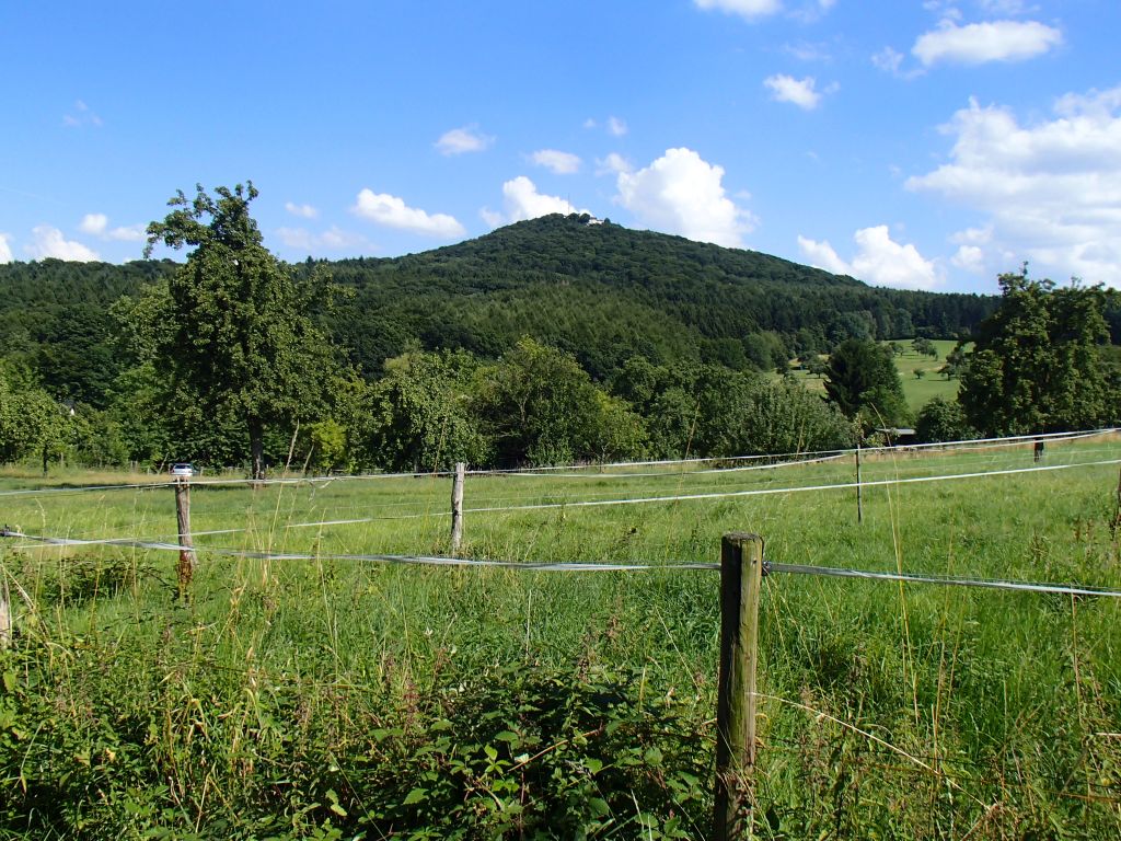 Am sehr unspektakulären Kleinen Ölberg kamen wir kurz vorbei. Nach ca. 3 km bergab erreichten wir dann die ersten Häuser von Thomasberg um nach einer Kehre den Ort sofort wieder zu verlassen. Hier bewegten wir uns voll in der Sonne (s. links Mitte) und konnten feststellen, wie viel Kühle der Schatten im Wald uns vorher beschert hatte. Wir waren dann froh, bald wieder im Wald zu sein. Auf meist breiten Wegen ging es weiter bergab. Die letzte Wegstrecke führte uns dann noch mitten über eine Wiese. Nach einer sehr schönen Wanderung erreichten wir das Auto. Wir waren bester Dinge, wenn auch leicht von Insekten zerstochen.