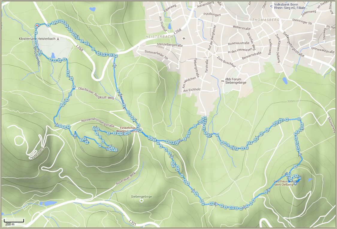 Zum Abschluss der diesjährigen Siebengebirgstouren, will ich von einer Wanderung im Nachgang der Alpenquerung berichten. Am ersten Samstag im August, bei wunderbarem Sommerwetter, zog es Hanne und mich hinaus in die Natur. Meiner Frau war es nach wandern, also arbeitete ich mit Hilfe der Software Basecamp von Garmin und meinen persönlichen Erfahrungen auf die Schnelle eine neue Route im Siebengebirge aus. Die Eckdaten waren 11,7 km Länge und +/- 470 Höhenmeter, wie sich am Ende der Wanderung herausstellen sollte. Als Startpunkt hatte ich diesmal nicht Königswinter gewählt, sondern den Parkplatz der Klosterruine Heisterbach, der kurz hinter Oberbollendorf liegt.